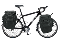 長期間のツーリングにはマウンテンバイク(MTB)が最も多く使われています。オフロードを走ることが出来る頑丈な車体と車輪を持っているので40~50Kg にもなる荷物にも耐えられます。また、タイヤをはじめとする部品の規格はMTBのものが世界で最も普及しているため、海外で走る場合は有利なのも強み。左の車両は、MTBをベースに開発されたツーリング車です。