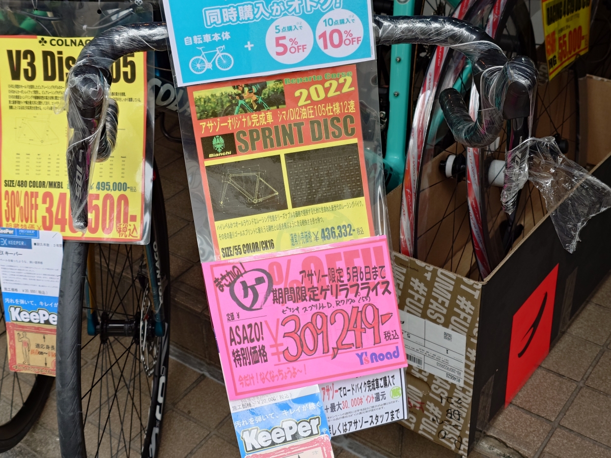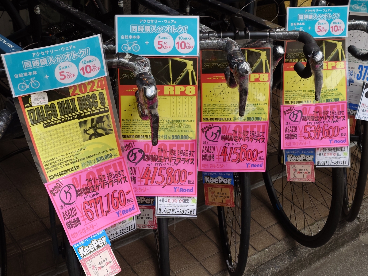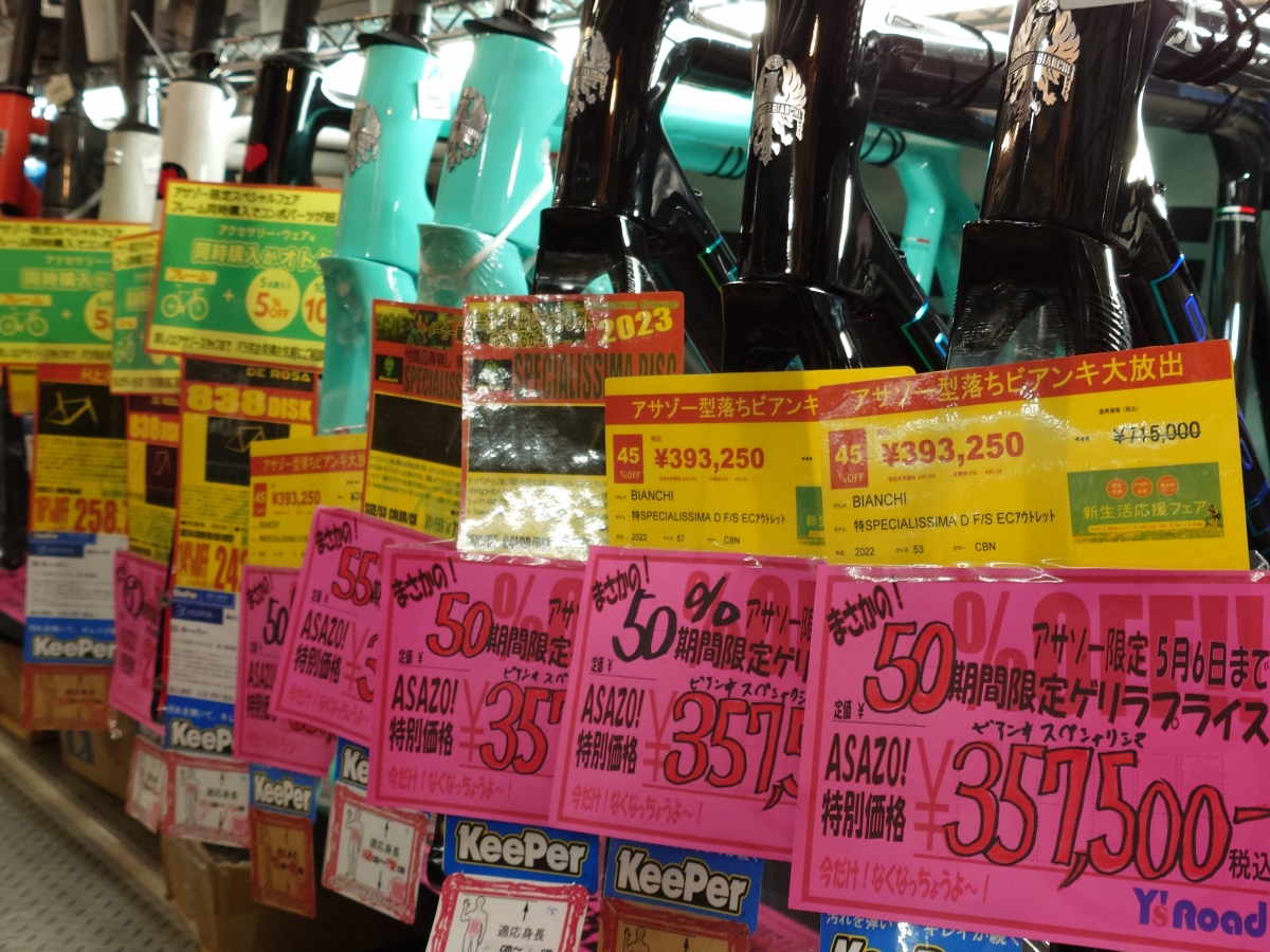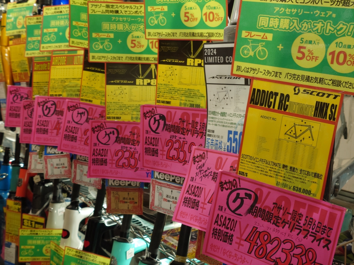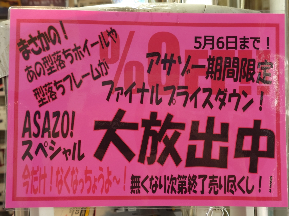 やってきました!久しぶりのアサゾーゲリラセール!!フレーム!完成車!ホイール!在庫限りの大放出です!!5/6までの期間限定価格となりますのでお急ぎください!!