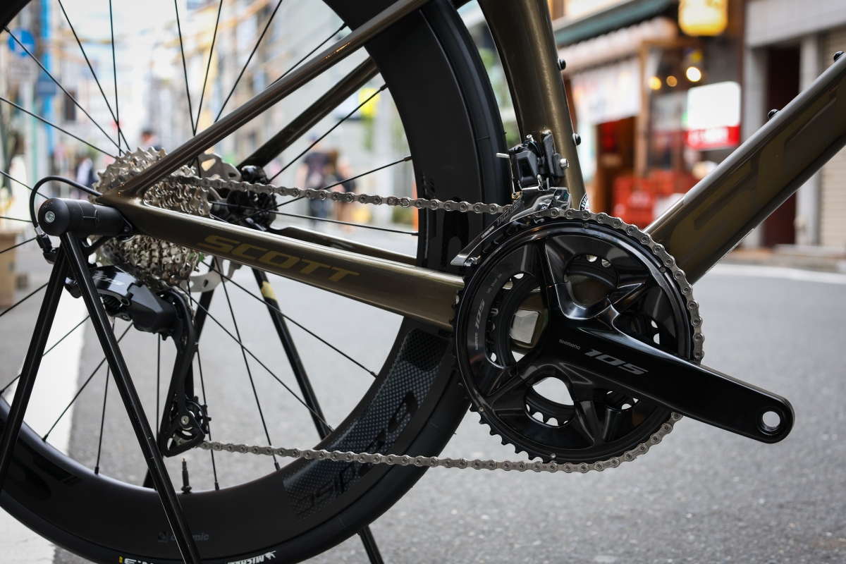 シマノ 機械式105 12速を装備。先代からデザインが一新され、鋭く角張った形状がエアロフレームとマッチしていてかっこいいですね!