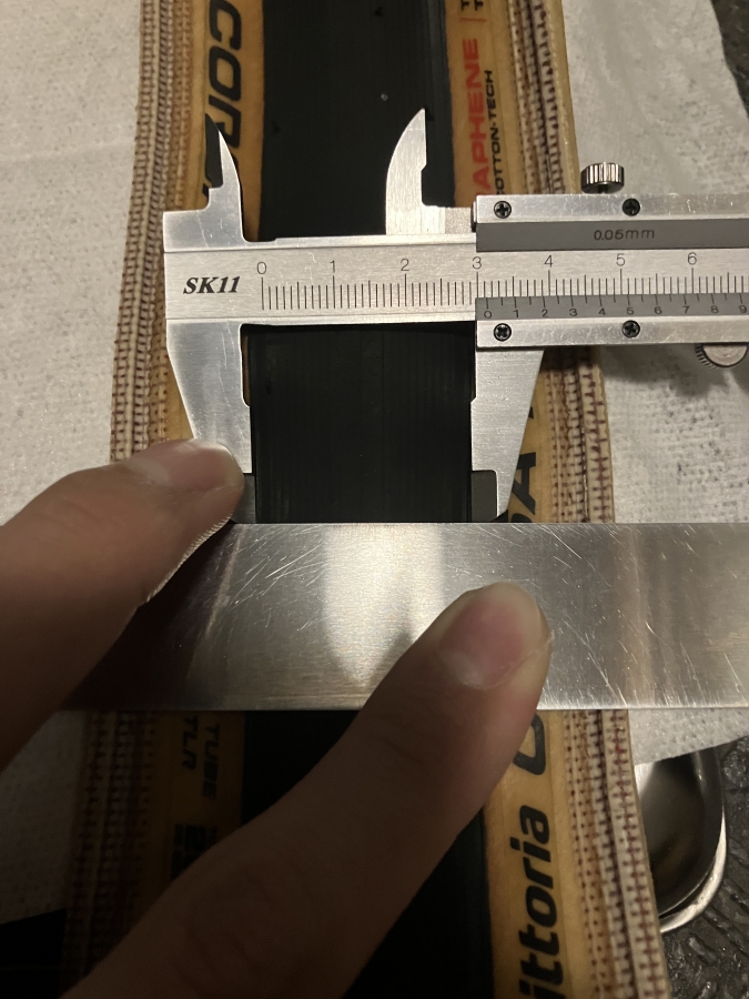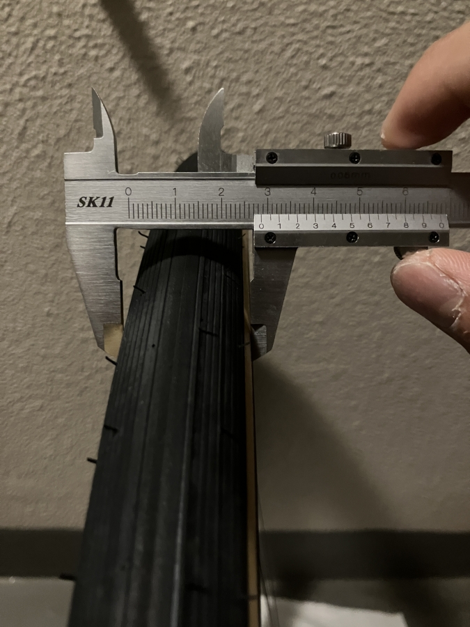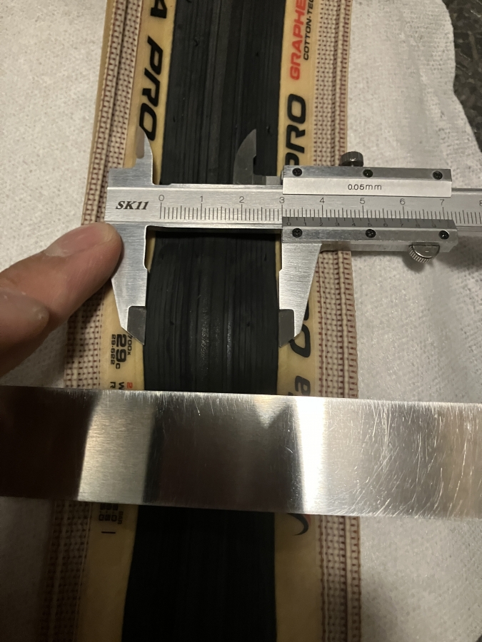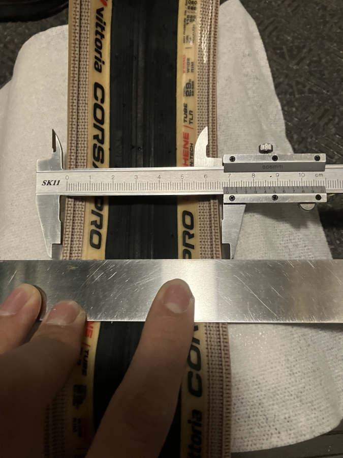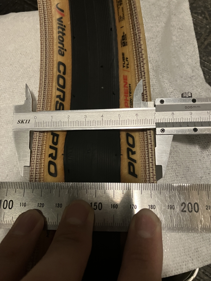 履いたタイヤは28cのVittoria Corsa Pro。タイヤ幅は3.5barで実測30.0mm程度でした。