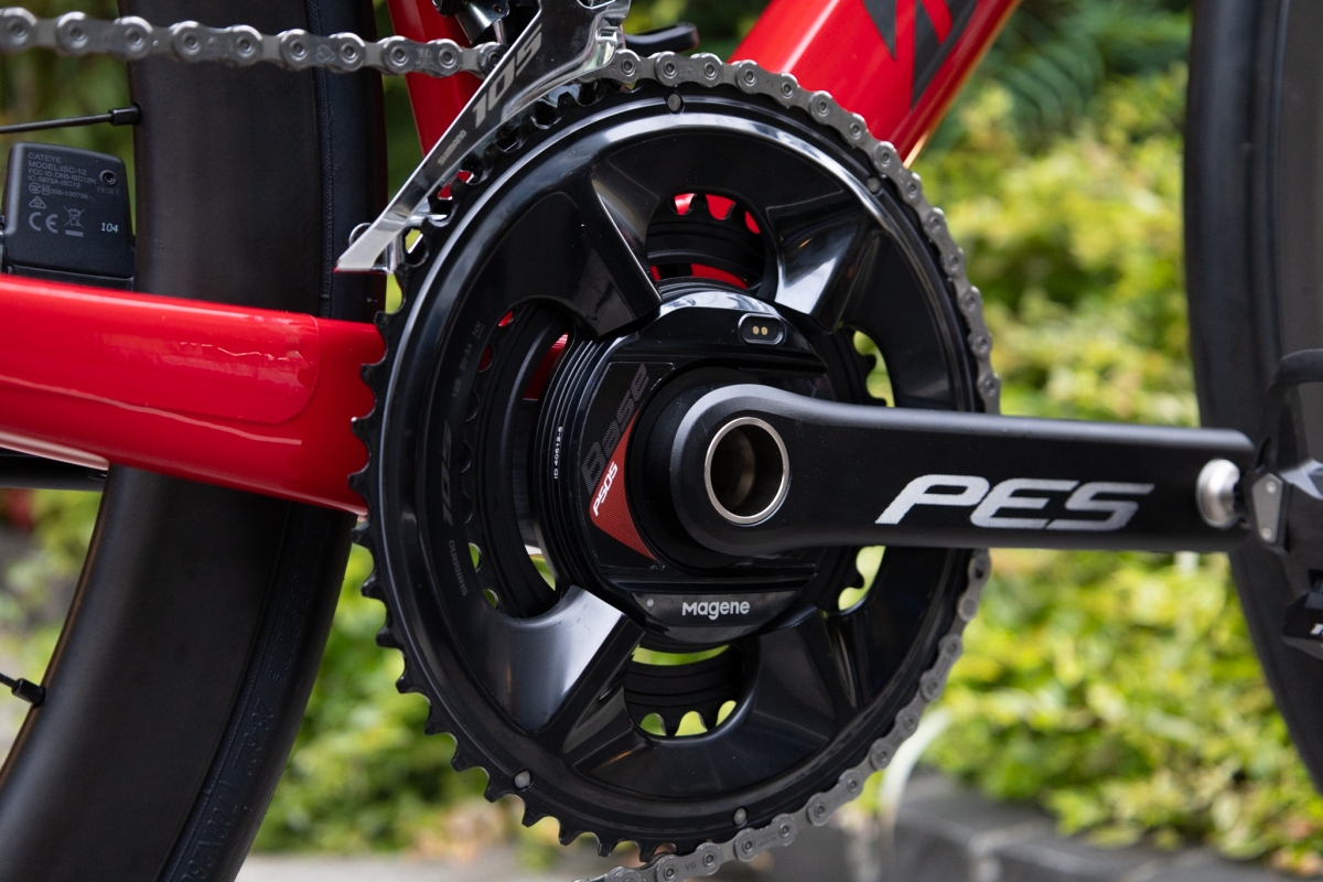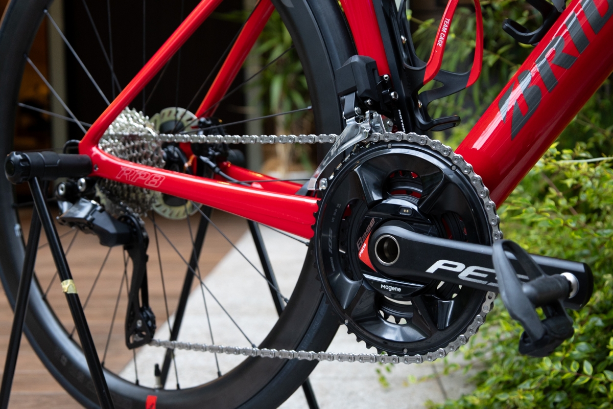 コンポーネントはShimano 105 Di2。現行モデルからDi2グレードがリリースされ、高速かつ、正確なシフティングが可能に。クランクにはマージーンのスパイダー型パワーメーターPES-P505を搭載。定価¥43,560‐税込という価格でありながら業界最高水準の±1.5%の精度を誇り、コストパフォーマンスの高い製品として人気です。