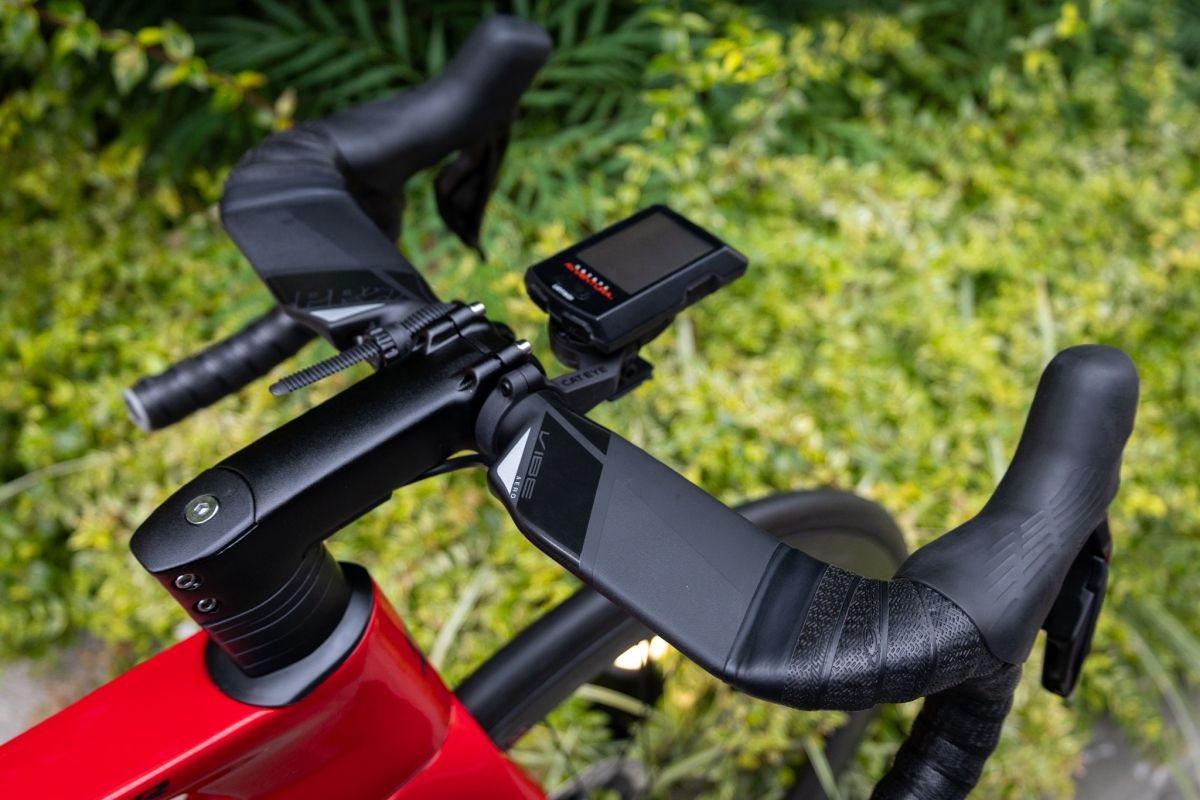 ハンドルはShimano Pro VIBE エアロハンドルバーを搭載。フラット部はなんと60mm超。旧VIBEエアロの進化版。重量は実測260gとこの見た目にしては軽い部類に。剛性感も申し分なくしっかりとライダーのパワーを自転車へと伝え、アドバンテージとなること間違いなしです。