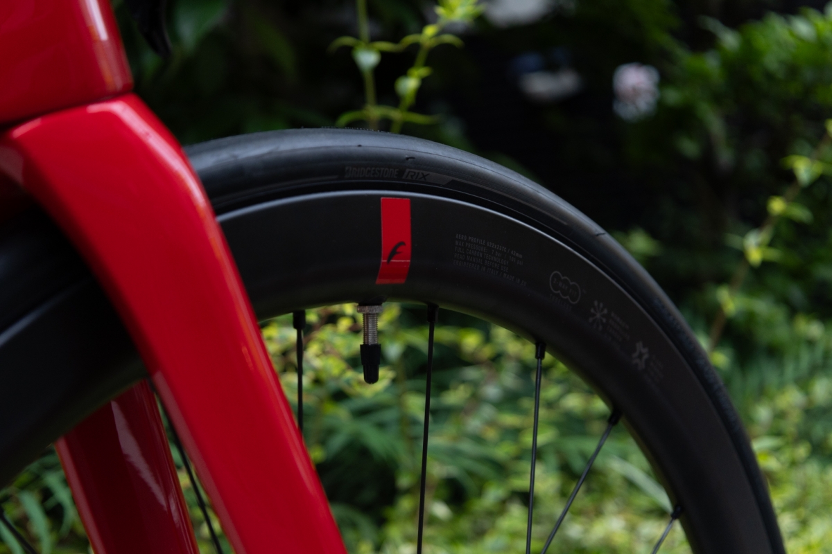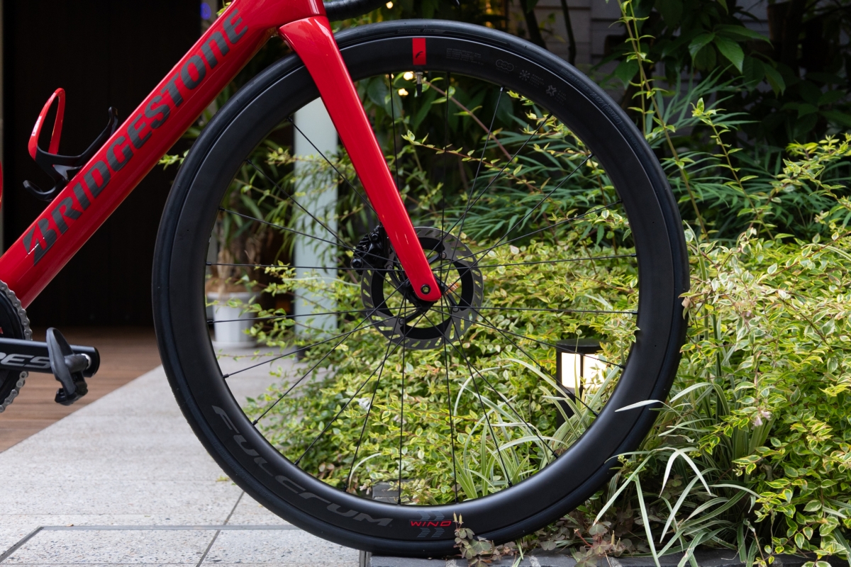 ホイールはフルクラムのWIND 42。しかしただのWIND 42ではなく、国内のみ販売のあった特別モデルの WIND 42 ”CUSTOM”。フルクラムのキーカラーであるレッドとグレーを組み合わせ、アグレッシブで上質な仕上がりに。誰もが目を惹くフレームカラーなだけに、ホイールにワンポイントで入るレッドがマッチしていてとてもカッコイイですね。