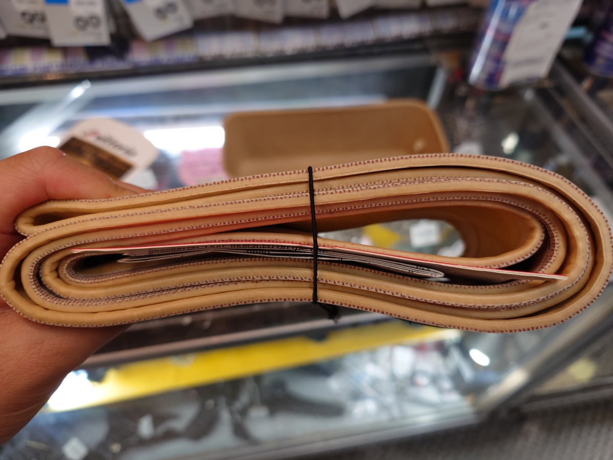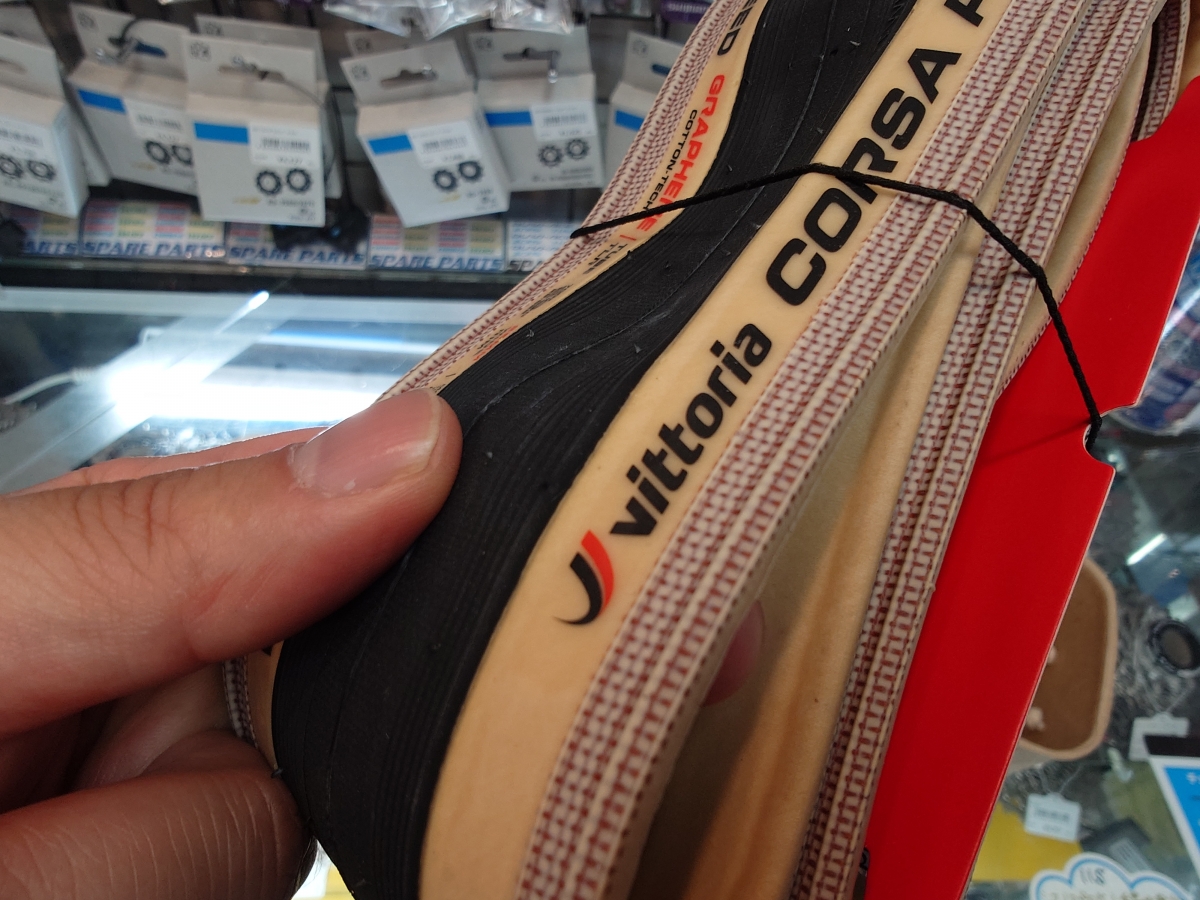 現行のCORSAシリーズは弧を描く形で成形されているのでパッケージ内ではもちろん膨らんでいるのですが、潰すと昔のオープンチューブラー時代のタイヤの様にぺったんこになりますね。