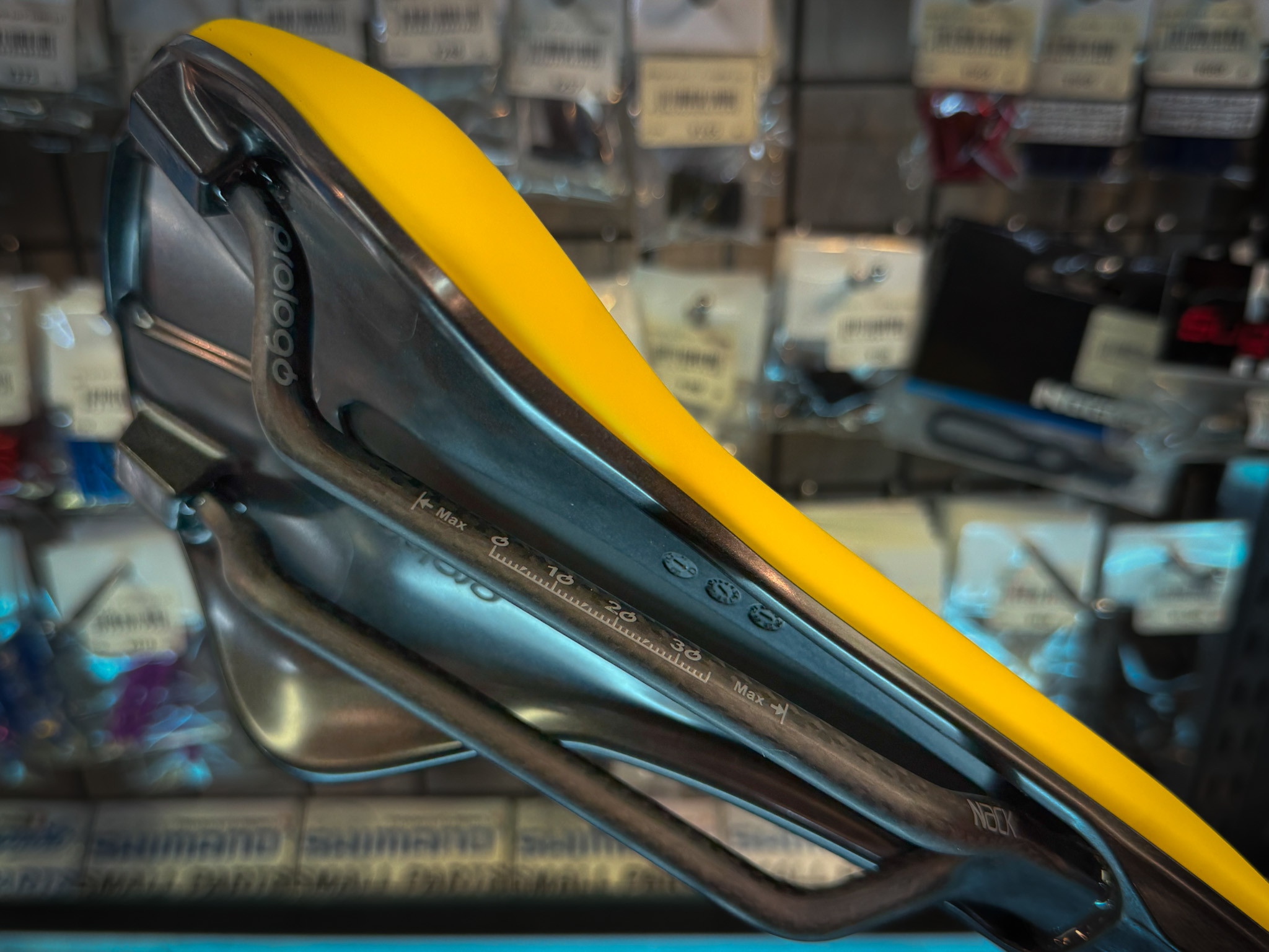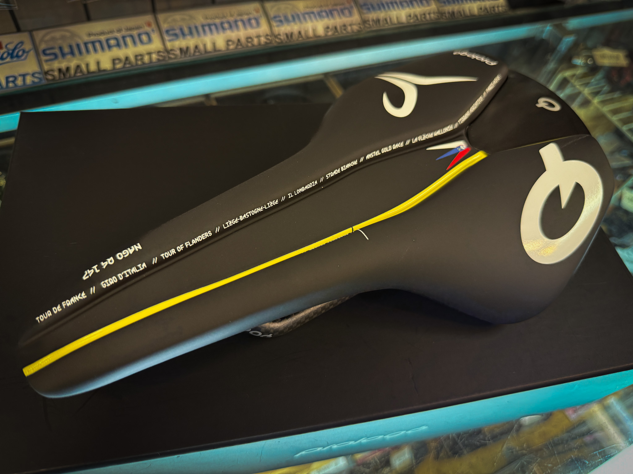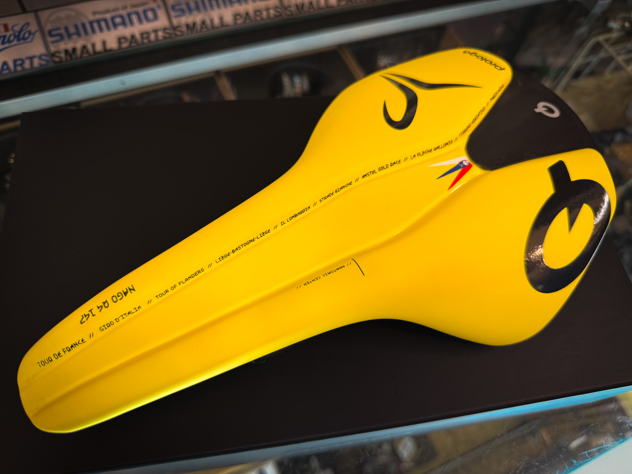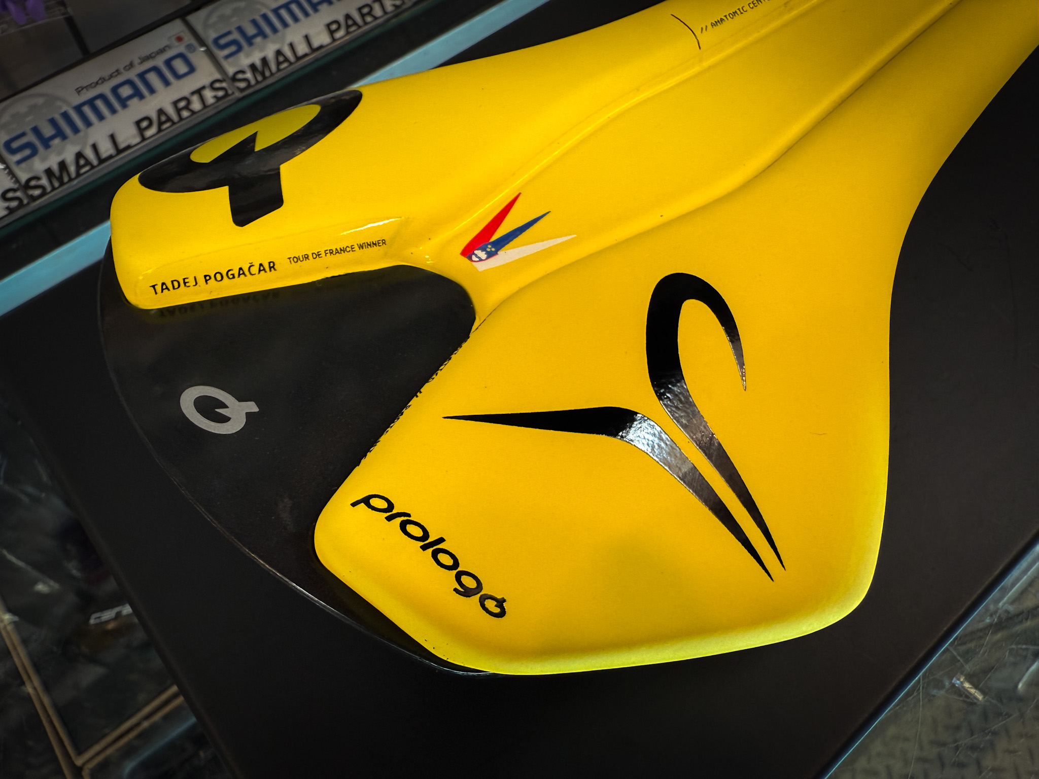 何といってもこの目を引く鮮やかなイエローカラー。TDFで言うマイヨジョーヌカラーですね。サドル中央にはスロベニア国旗をあしらい、パッド後方の左右にはプロロゴのブランドロゴとポガチャル選手のマークを配置。なんとも限定サドルらしい配色とデザインが特徴的でカッコいいですね。