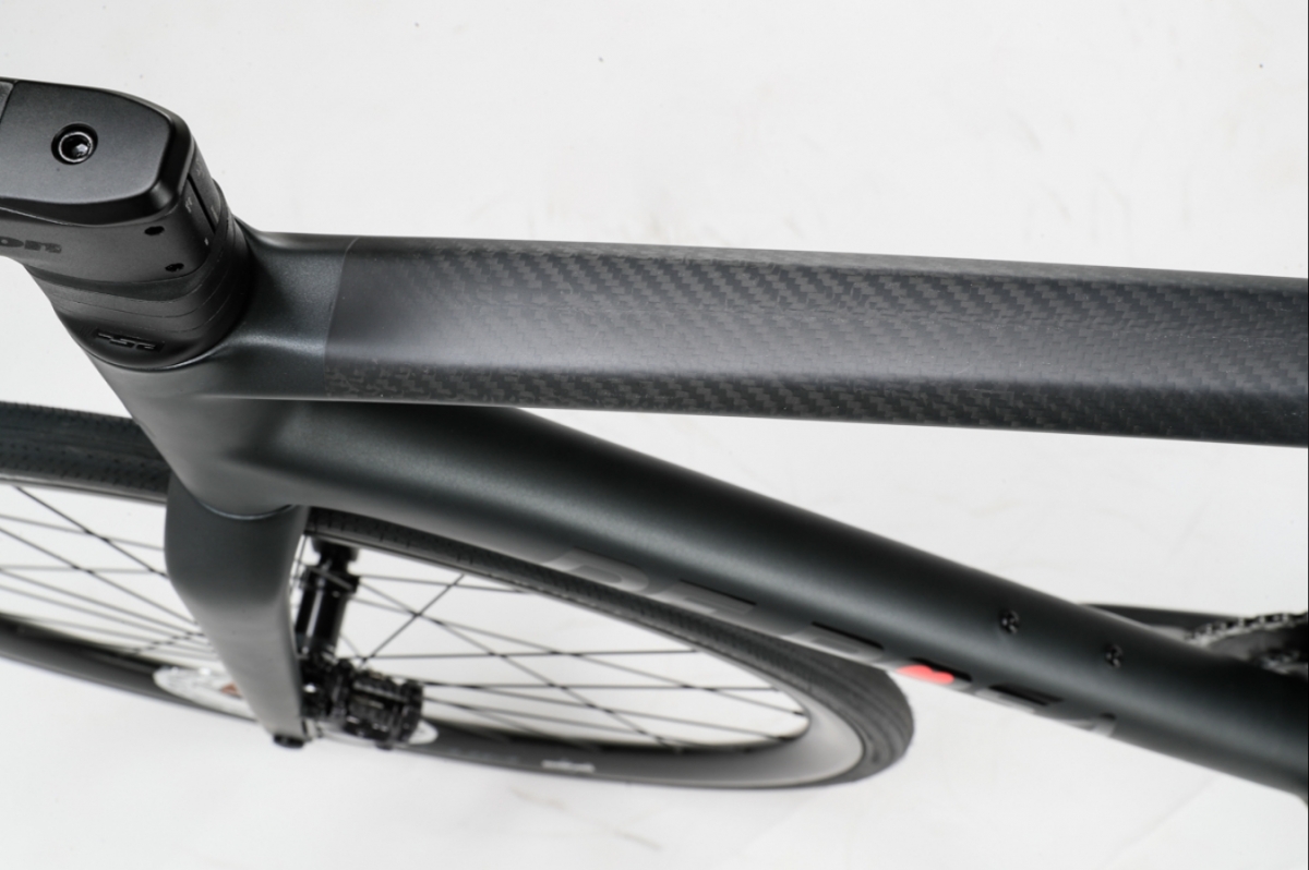 写真で見る限りはステルスカラーだけだと思うのですが、トップチューブにカーボンの織目を化粧として使っているデザインとなっています。