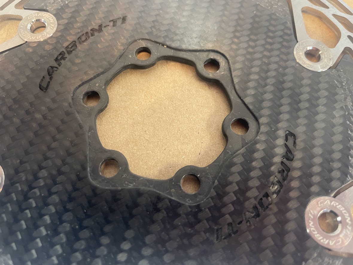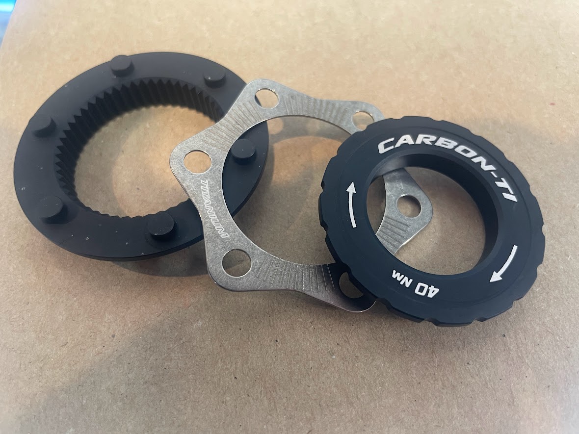 6穴タイプのローターに軽量のアダプターを使ってセンターロック化をしています。
