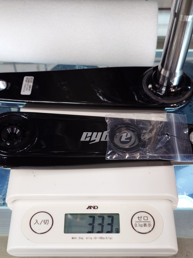 ステッカー貼り付け済みでぶら下がっているBBスペーサー含めて重量413gと超軽量です!!