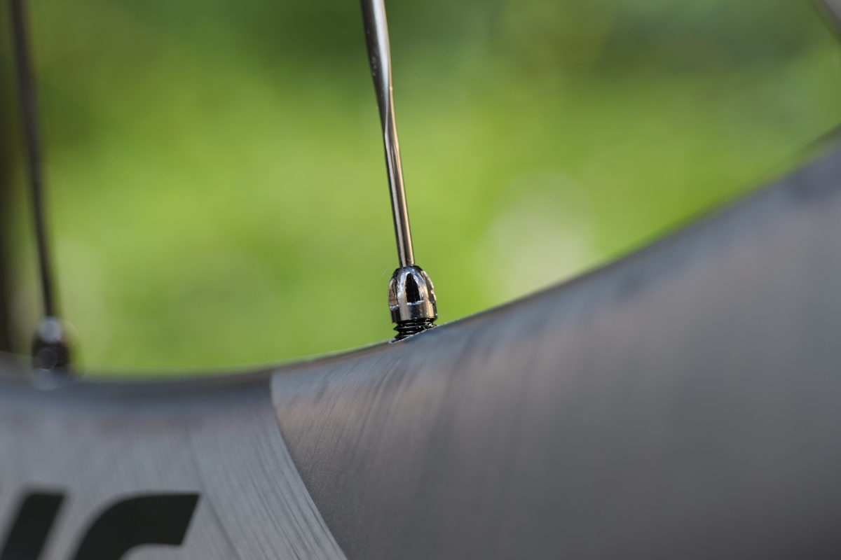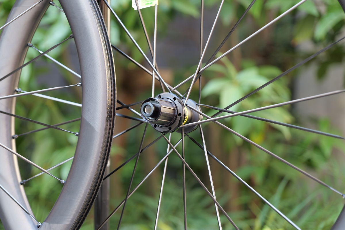 平たいエアロスポークではなく、レンズ型の中心が膨らんでいるエアロ形状となっているMAVIC専用のスポークです。