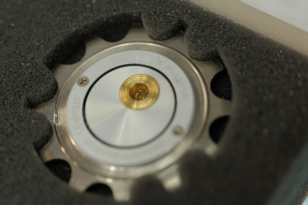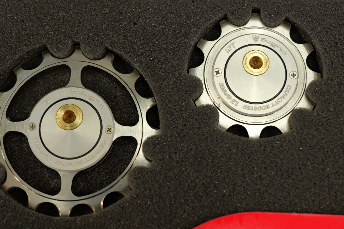 アウターが52tの場合は通常36tとのくみあわせになるのですが、このギヤにプラスしてキャパシティブースターという特殊なプーリーを使う事によって、チェーンのたるみを解消する事ができ、変速自体もSUGINOにより綿密に計算された形状により、確実な変速を実現しています!!