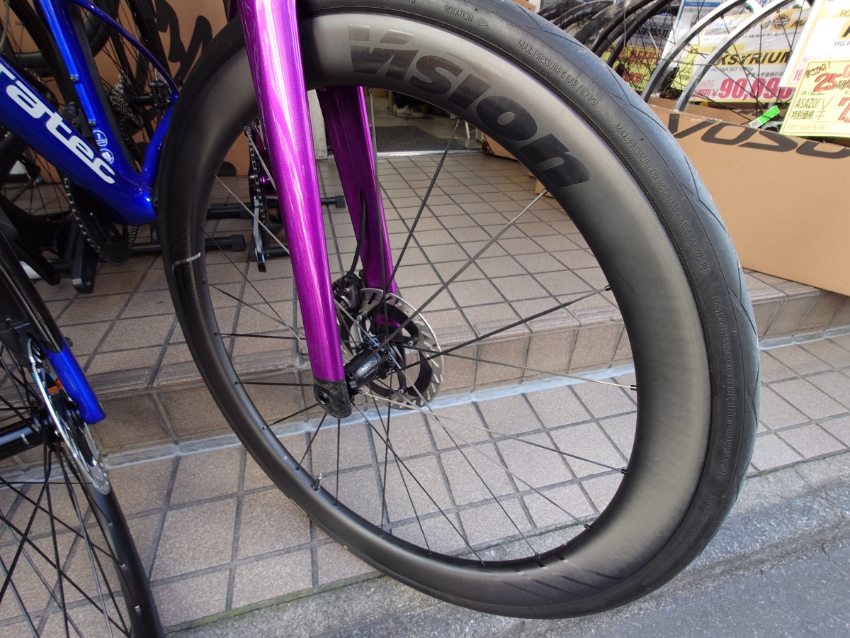 真っ暗な写真で分かりにくいですが、ホイールにVISION METRON 45 RSという最新のカーボンスポーク採用ホイールが入っています。