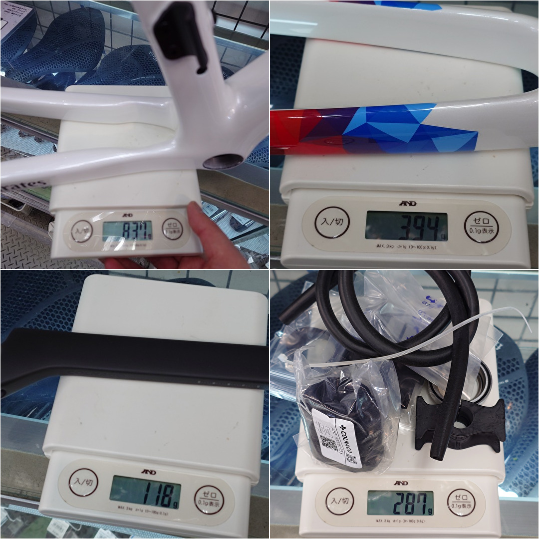 こういう測り方はあんまりしないので単純比較が難しいかもしれませんが、マニアックな方はその他のパーツ重量を調べて完成車重量を計算できるのではないでしょうか。