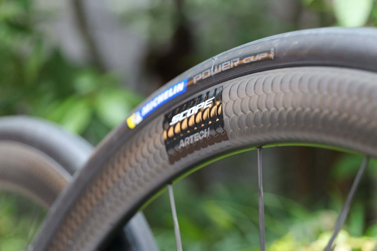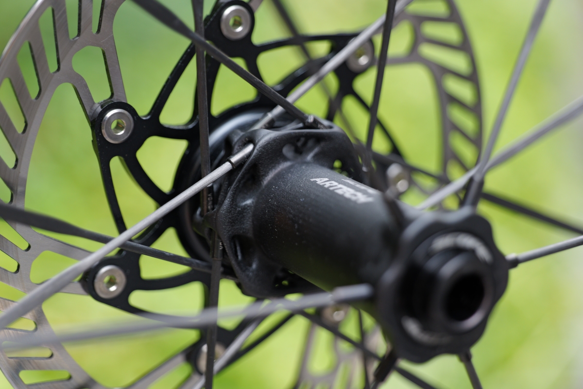 ARTECH 4のスペックとしてはリムハイト45mm、内幅23mmフックド、特殊なうろこ状の加工がされたカーボンリム、スポークはVONOAカーボンスポーク、ハブはスカルマロイという素材で作られた199gのハブセット、重量1120gという現代のテンションスポークカーボンホイールの中でも突出して高いスペックを誇る一本となります。