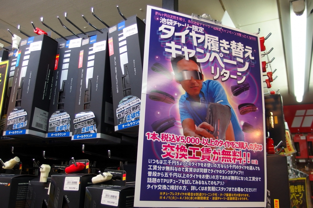 ただいま池袋チャーリー店では4/1(火)~4/30(水)までの期間中、1本につき税込¥5,000-以上のタイヤをご購入いただいたお客様にタイヤ交換作業工賃が無料になるキャンペーンを開催中‼