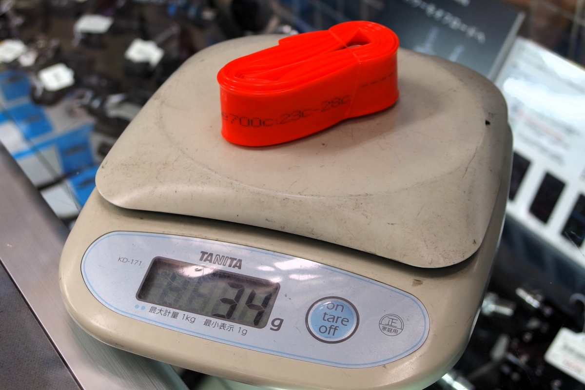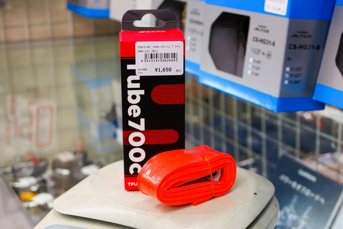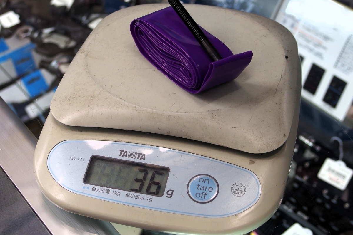 一般的なブチルチューブ約100gに比べ1/3の36gという驚異の軽さは実測でも誤差ナシ。しなやかな弾力と強さを備えておりパンクにも強く回転抵抗減にも期待。ウレタン樹脂という特性上、耐熱性は高くないためリムブレーキでの長時間のブレーキングは注意。