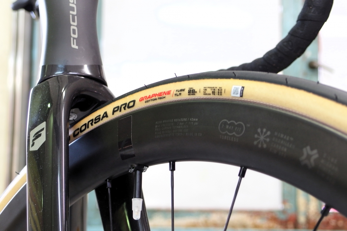比較的パリッとした走りのWIND42を採用していますが、組み込むタイヤは極上のしなやかさが魅力のコットンケーシングタイヤ「VITTORIA CORSA PRO」仕様。さらにしなやかさを引き出すためラテックスチューブも検討しましたが、ここは耐パンク性・軽量性・抵抗減のTPUチューブを採用。