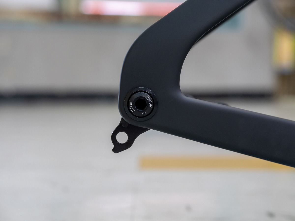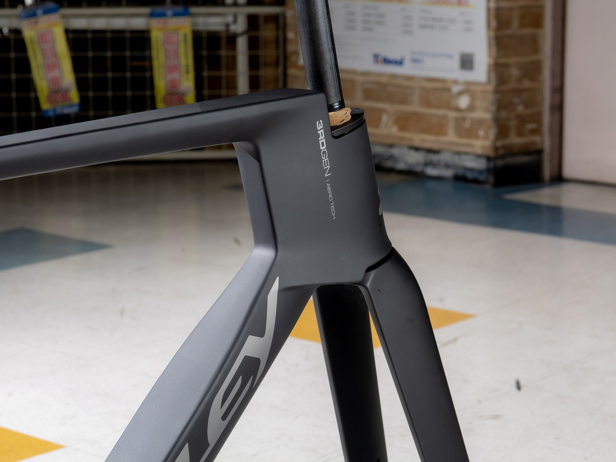 フロント三角形の分厚さたるやヘッドチューブが太すぎてシートチューブももちろん太いはずなのですが細く見えますね。