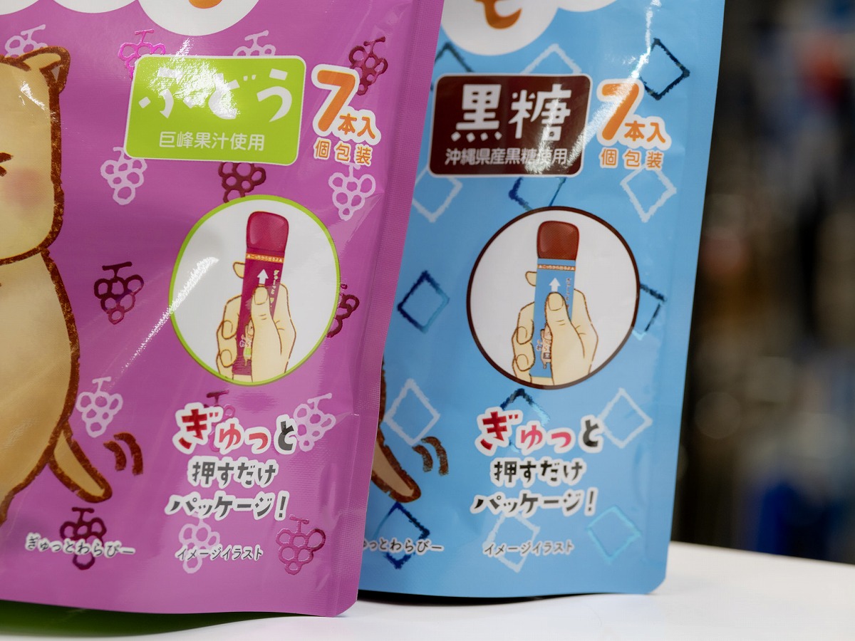 手で押し出すパッケージで片手でラクラクに食べられるものになっていて