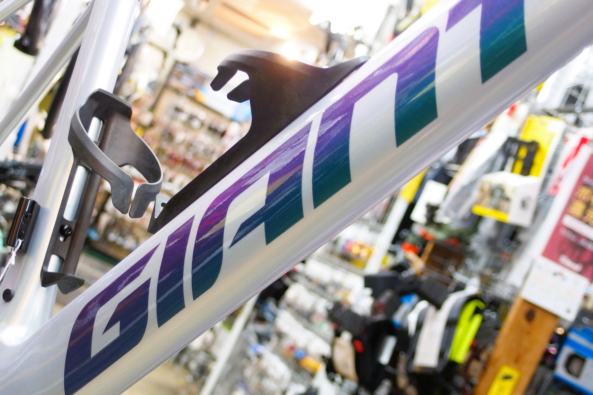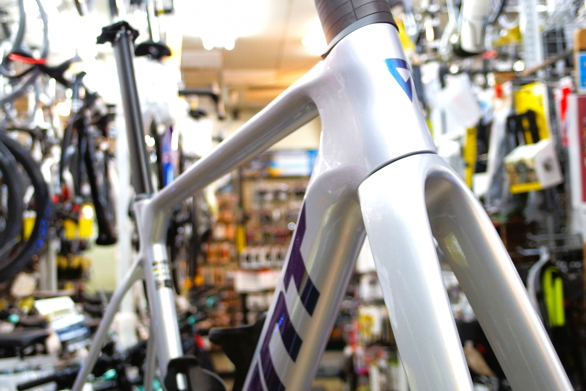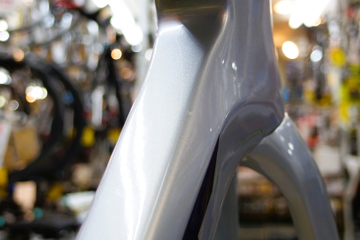 ダウンチューブロゴとトップチューブに施された見る角度によって色彩を変化させるカラーが魅力で、発表直後に完売となったのも頷けるほど。