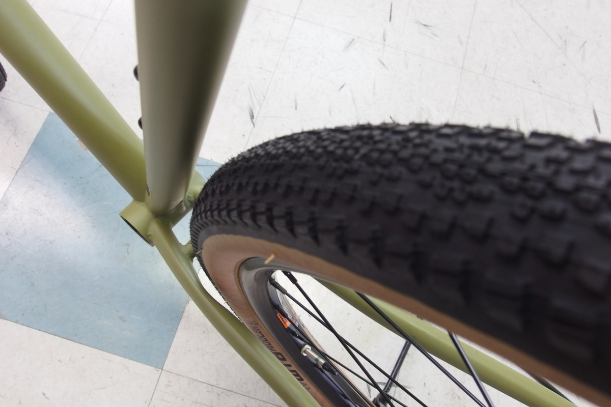 実際に45c幅タイヤのホイールを履かせてみたところ、余裕のクリアランス。砂利やぬかるんだ道を走っても泥詰まりなどの心配は無さそうです。