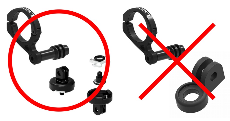 その固定穴を利用して上記の画像のようなGo Pro対応マウント(オス側:2枚板/メス側:3枚板の組み合わせで固定する構造)に換装が可能となっています。