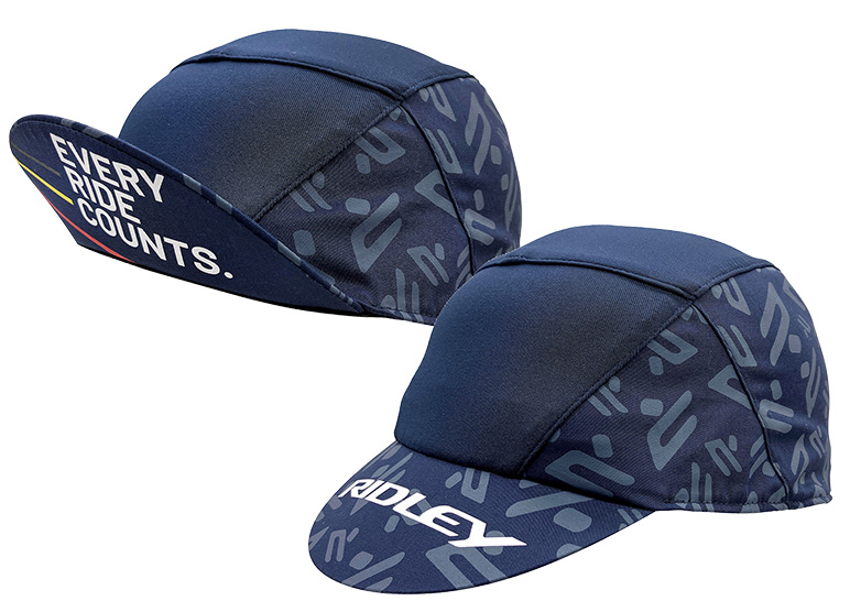 RIDLEYのシンボルマーク「R」をモノグラム調にデザインし、ツバの裏に「EVERY RIDE COUNTS.」の文字を配置しています。