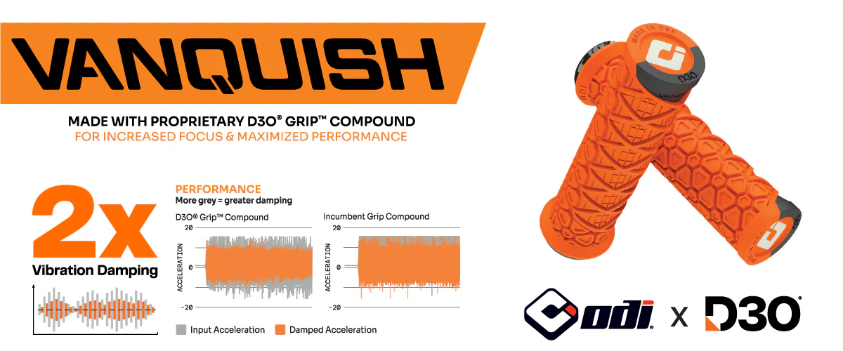 上下で異なるワッフルパターンにより「打ち負かす/克服する」を意味するところVANQUISHの名の通り、振動・衝撃を打ち負かし握りやすさと快適性が向上しています。グリップエンドのロゴと「MADE IN USA/D3O」の刻印で上下を間違えずに取り付けができます♪
