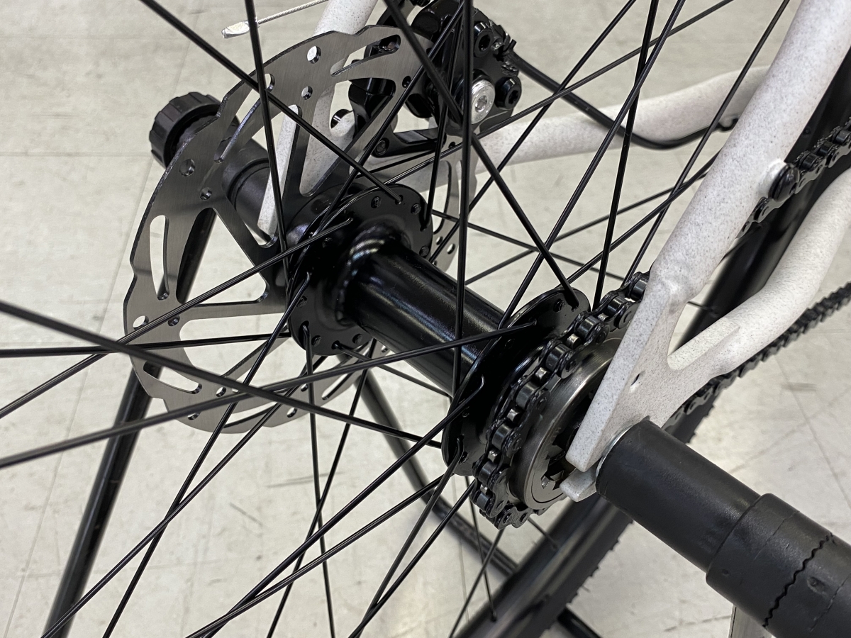 ディスクブレーキ対応のシングルスピード専用ハブを使った少し珍しい仕様。はじめは乗りやすいフリーコグが付いていますね。一般的なピストバイクと同じく固定ギアにして乗る事も出来ちゃいます。