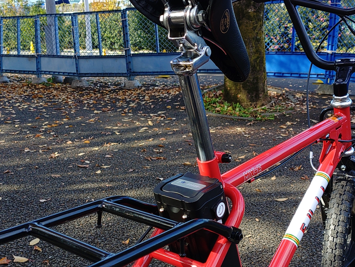 走行に関わる機能ではありませんが、バッテリーの取り外しを行う際にサドルが干渉しないようお辞儀をするようなスタイルに。試乗の際は漕ぎやすいようにサドルを高めで乗りましたが、BMXらしいサドルベタ下げスタイルでもバッテリーの付け外しに困ることは無さそう。