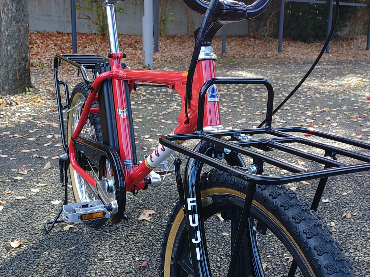通常版では装着しないフロントラック。お買い物に役立ちそう?フロントホイールにはプラ5スポークが良い味出してる♪(※箇所によっては当店でカスタムできない場合もございます。)