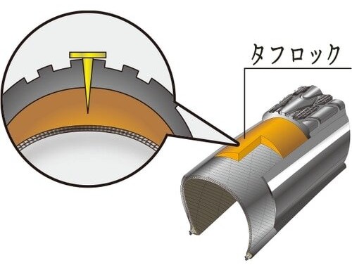 内部に組みこまれた耐パンクベルト「タフロック」に加え、これだけ分厚けりゃ耐摩耗性能も高く、細かなガラス片くらいなんかじゃ貫通しないってワケだ。