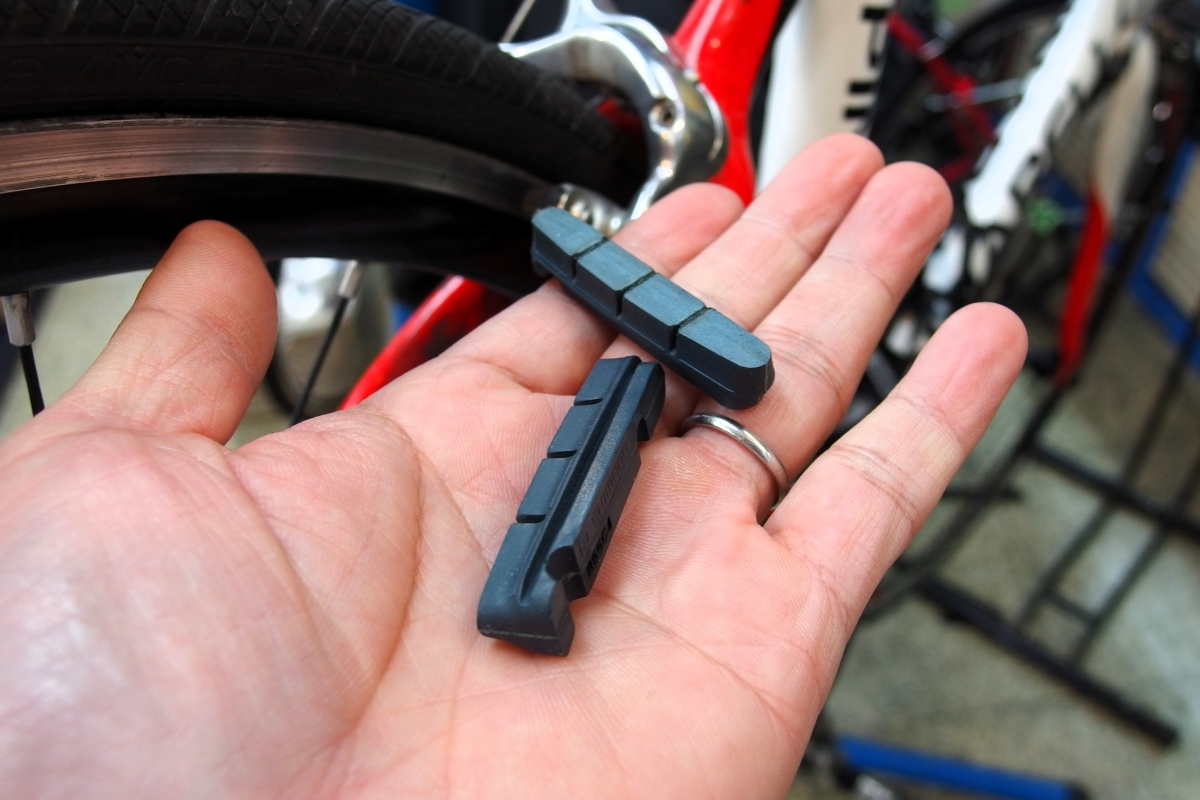 リムの材質が変わりますので、既存のアルミ用ブレーキシューでは溶けてしまったり・リム自体を痛めてしまいます。カーボンリム用のブレーキシューも合わせて交換していきます。