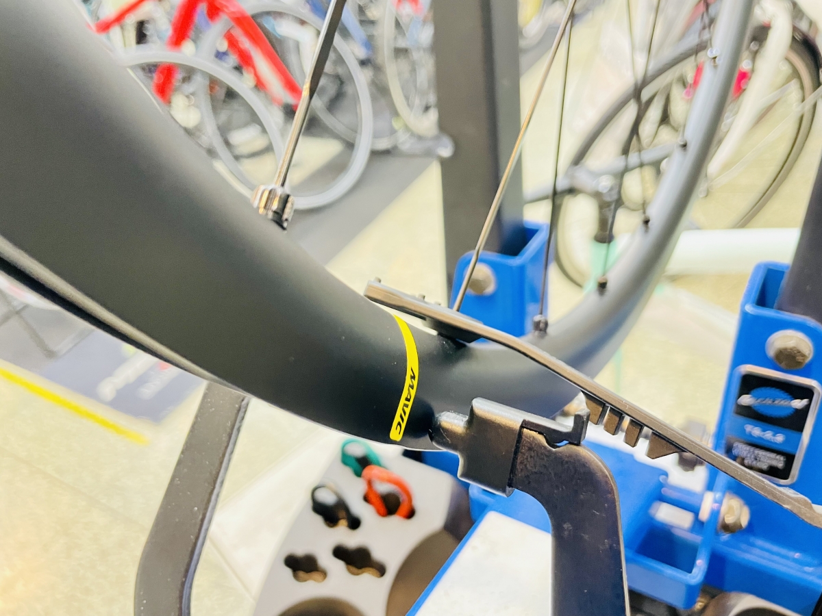 まずはホイールの精度を確認します。大げさではありますが専用の器具を用い一本一本チェック。