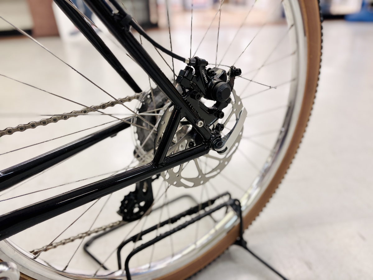 クラシックな雰囲気の自転車ですが、ブレーキは現代のトレンドのディスクブレーキになっています。