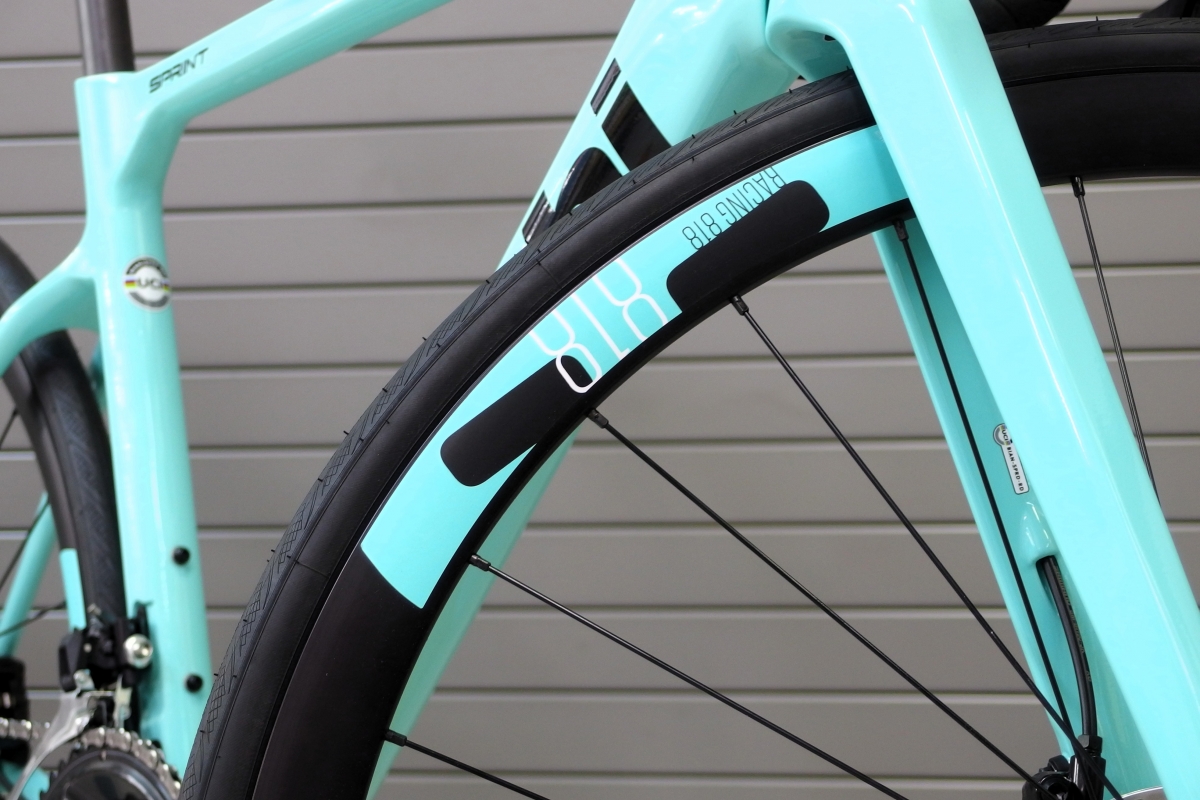 FULCRUM RACING 818という通常にはないラインナップのモデルでセミエアロなリムハイトがスプリントの走りを引き上げてくれています。
