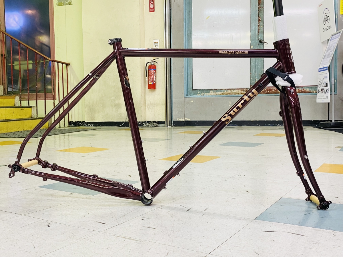 先日入荷したストラグラーと比べると、よりロードバイクに近いイメージだけどそれでいて太いタイヤもいけちゃうのがミッドナイトスペシャルのポイント