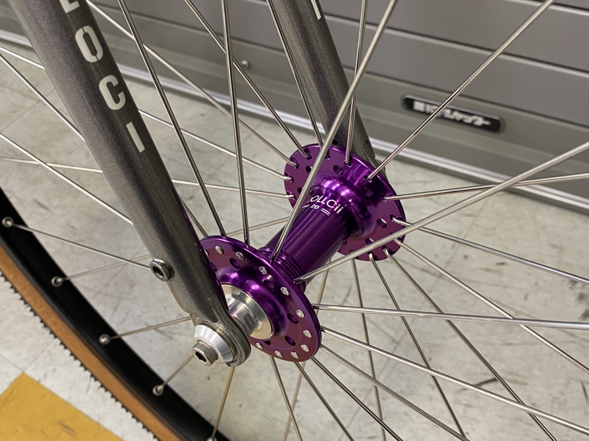 H PLUS SONのTHE BOXをチョイス。もはやローハイトリムの名作アイテム。ハブは「VELOCI RC20 TRACK」。VELOCIのパープルは発色良くて綺麗ですな。スポークはシルバーを合わせてキラキラに。