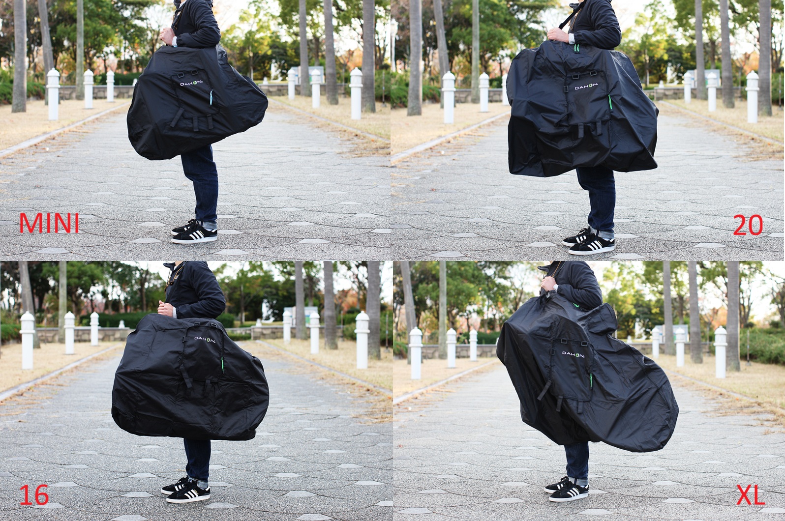 ご紹介の「SLIP BAG 」はDAHON折り畳み自転車ラインナップの各サイズに合わせた「SLIP BAG MINI」・「SLIP BAG 16」・「SLIP BAG 20」、「SLIP BAG XL」の4サイズラインナップを純正で用意。