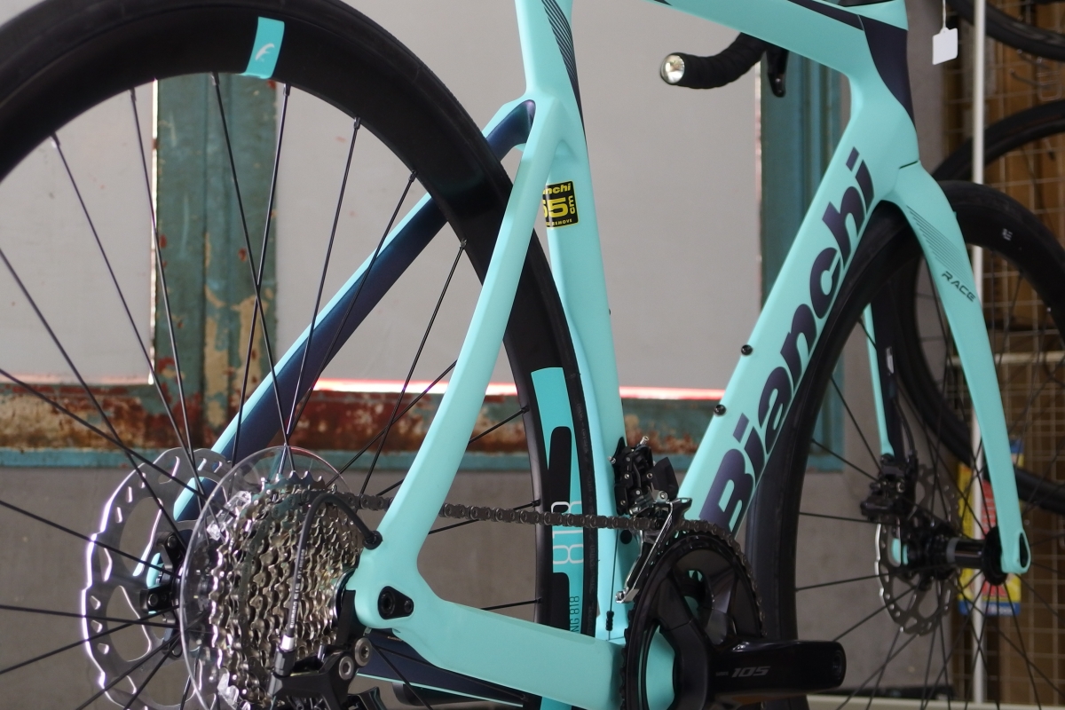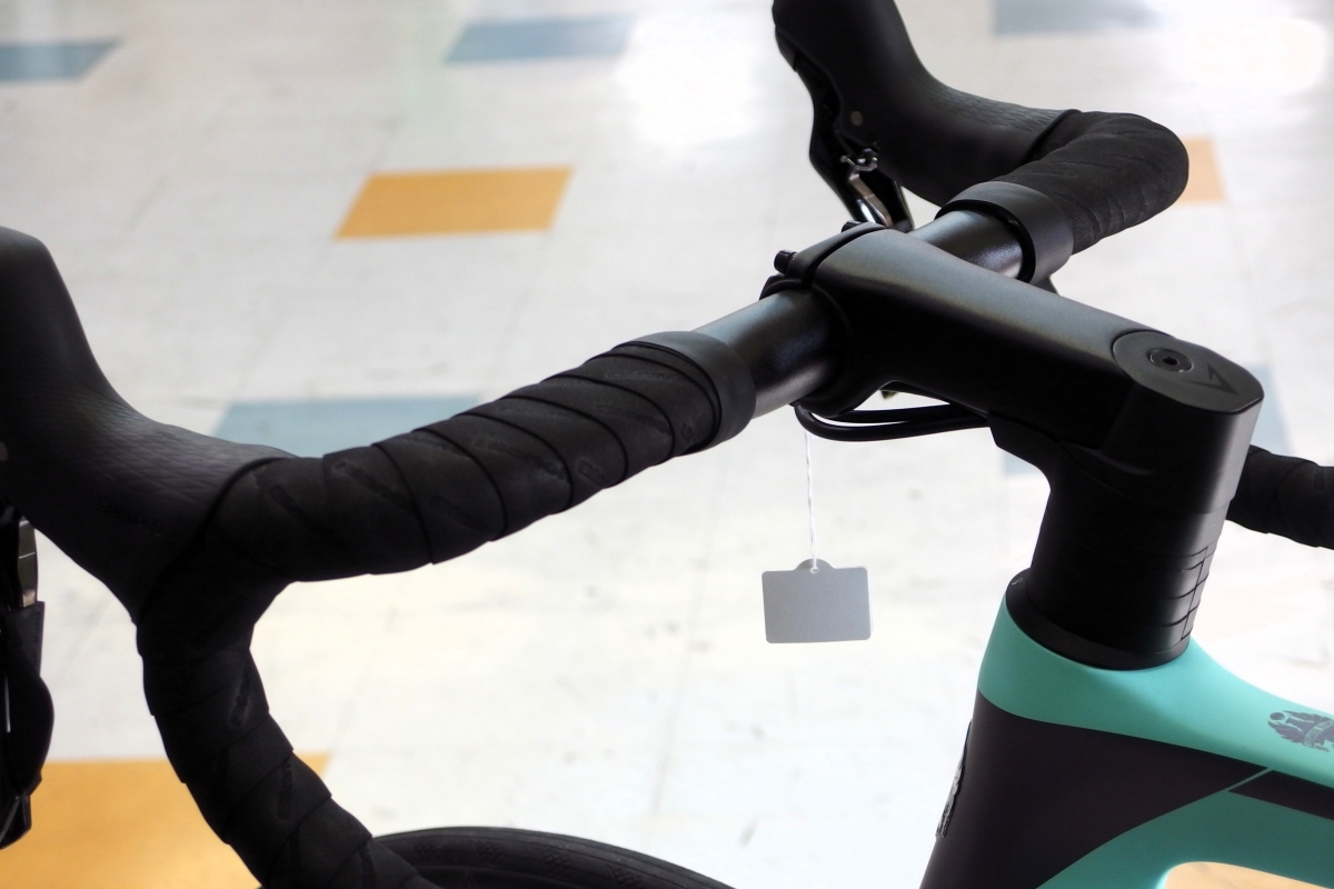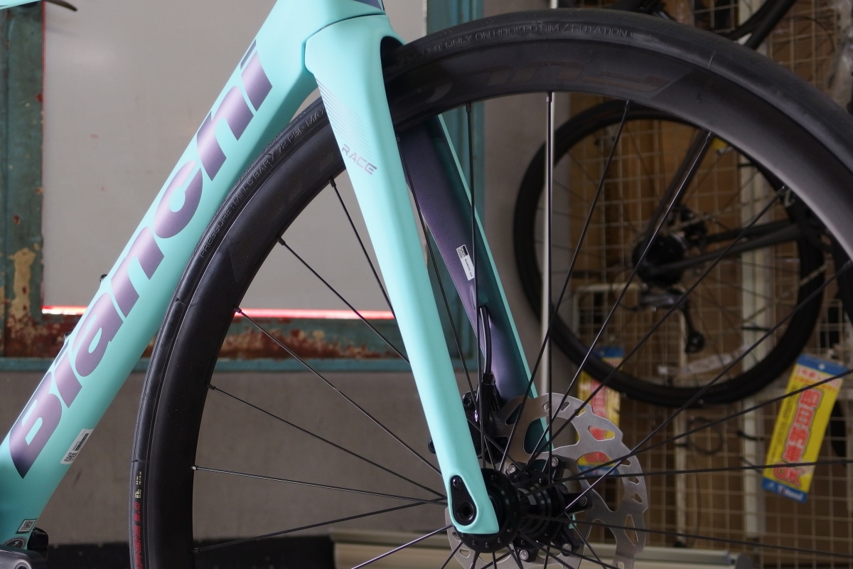 ビアンキといえばのカラーリングですが、艶消しチェレステカラーをベースに各部に入るグラフィックも高級感のある色合いが差し色として入りとてもカッコいいです。