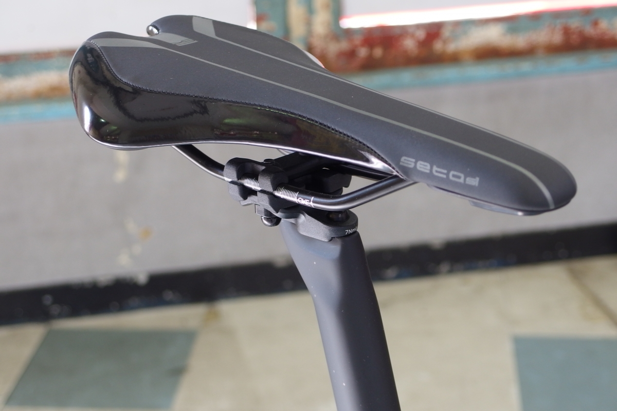 涙滴形状の専用シートポストも整流効果に長けており、サドルレールを受けるやぐら部分は前後位置を入れ替え可能で、トライアスロン/タイムトライアルなどの前乗りポジションにも対応。