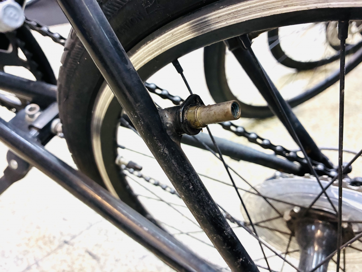 古いブレーキをフレームから外すと表れるのがボコッととがったV・カンチブレーキ台座。そして交換へ。