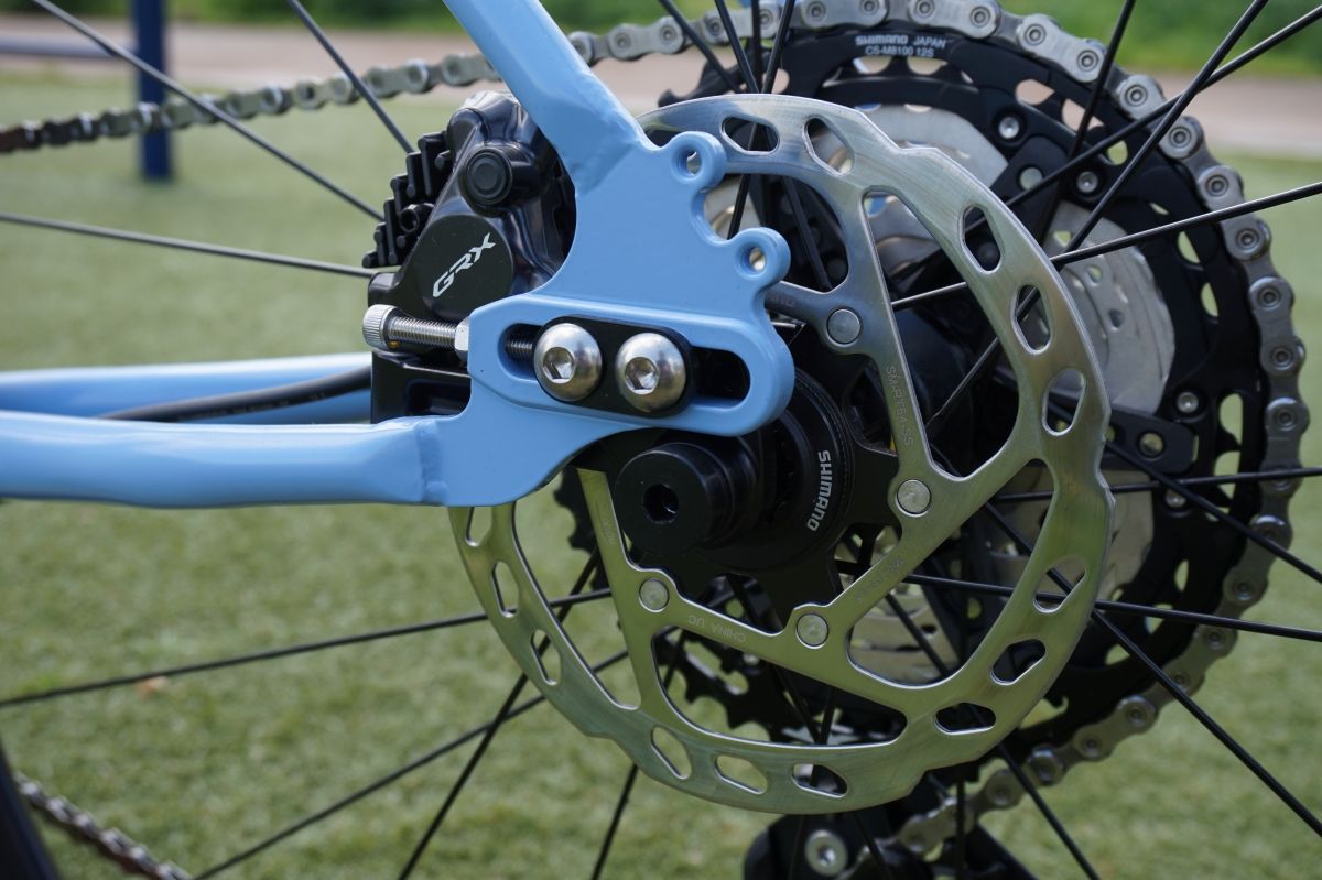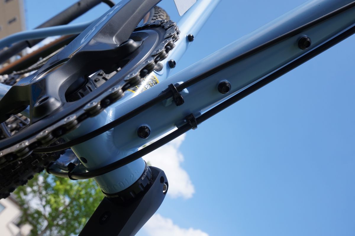なお、リアエンドに目立つ左右2本ずつのシルバーのボルトは『スライダーエンド』で、ホイール固定位置を前後に調整できます。これにより、650Bホイールや700Cホイールを使用してもタイヤのクリアランスを調整可能であったり、またチェーンテンショナーなしでのシングルスピード化も可能となっています。