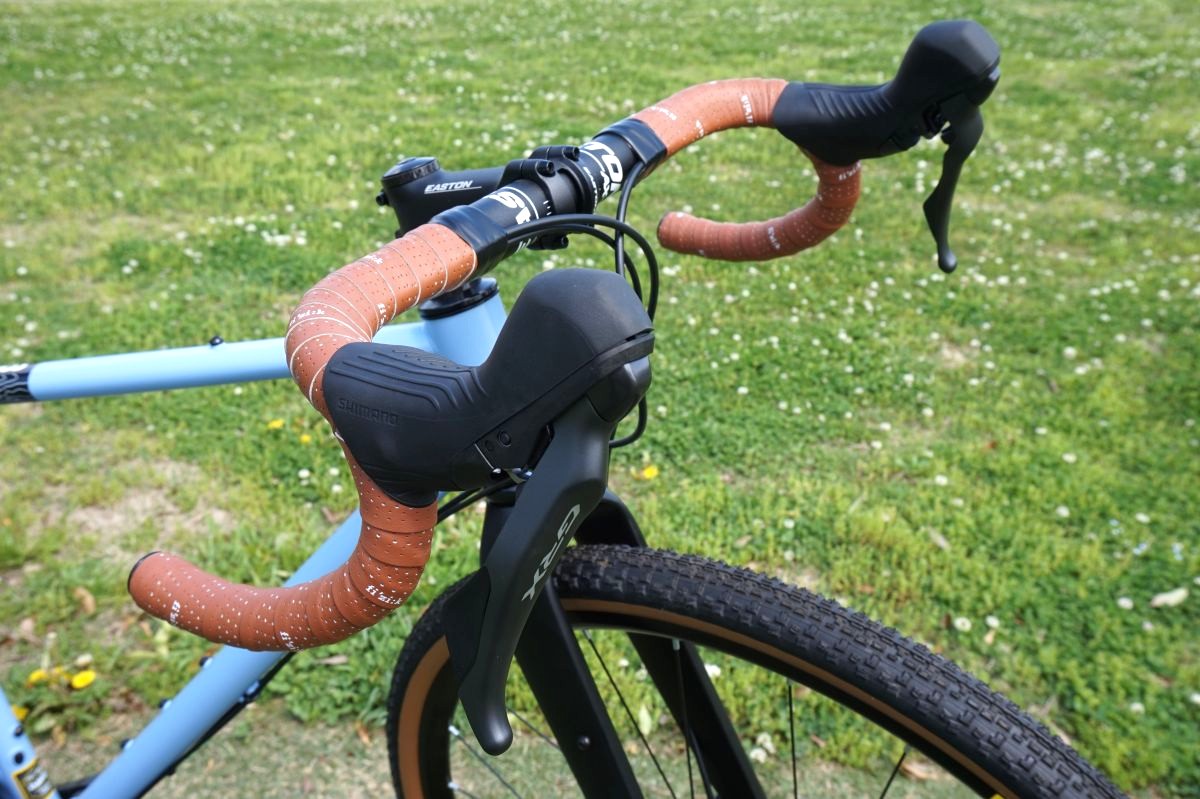 ギアはフロント42T、リア10‐45T。ギア比は4.2~0.93。平坦から丘陵地にかけての速いテンポでのグラベルツーリングに向いた仕様になっています。