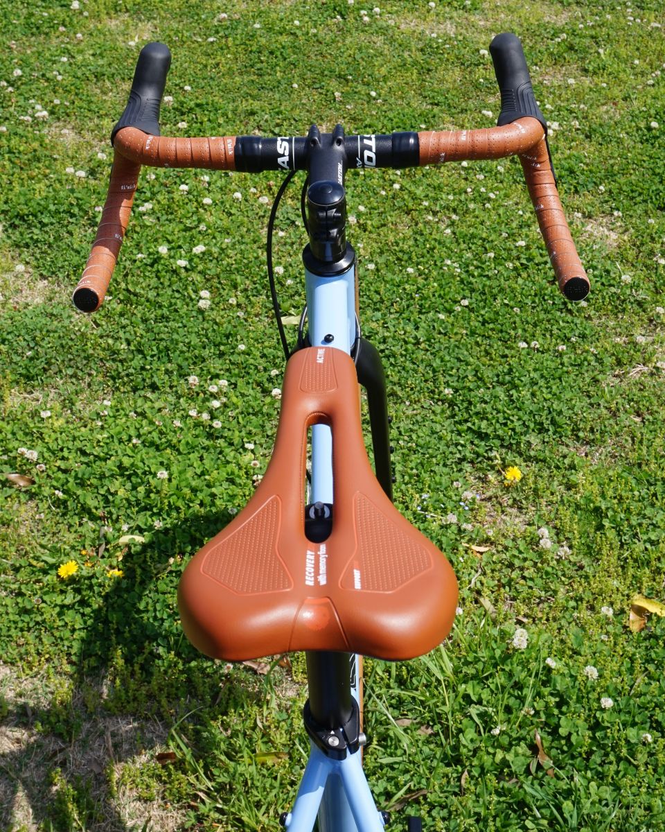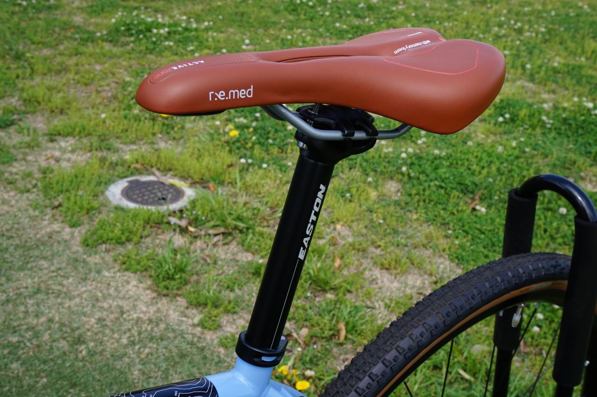 サドルはSELLE ROYAL R.E.MEDで、これはfi’zi:kのバーテープとお色を合せてあります。SELLE ROYALはfi’zi:kブランドを保有する会社なので、ブランド名が違うだけで同じ会社。もともと合わせて使うことを前提にしたカラーなので、ばっちり同色です。