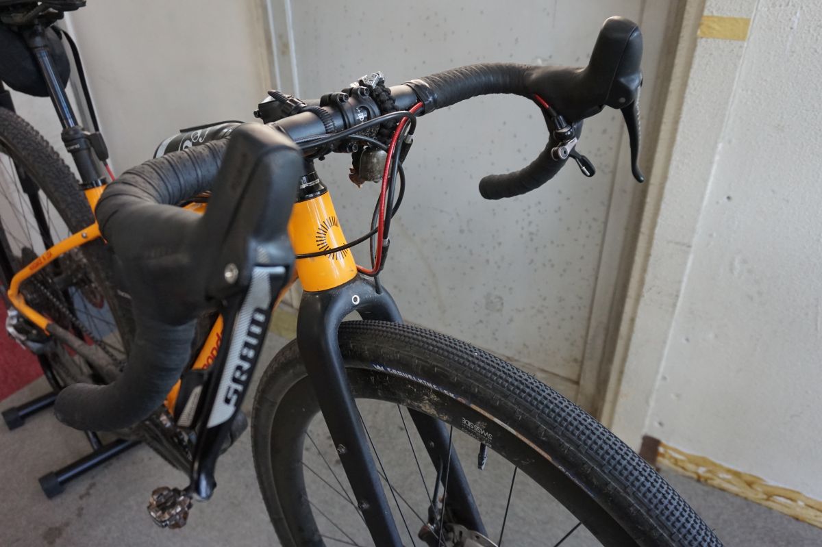マイクロシフト製コンポーネントでアッセンブルされていたものを、1×11速のSRAM RIVAL 1に換装しています。てか、残ってるのフレーム&フォークだけじゃないかな?ステムも長さ変わっていると思われ。