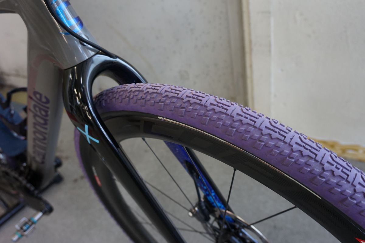 SCOPE CYCLINGのロードバイク用ホイールR4Dに、タイヤはGravel King X1 700×40Cで、2024年限定パナレーサーパープル。