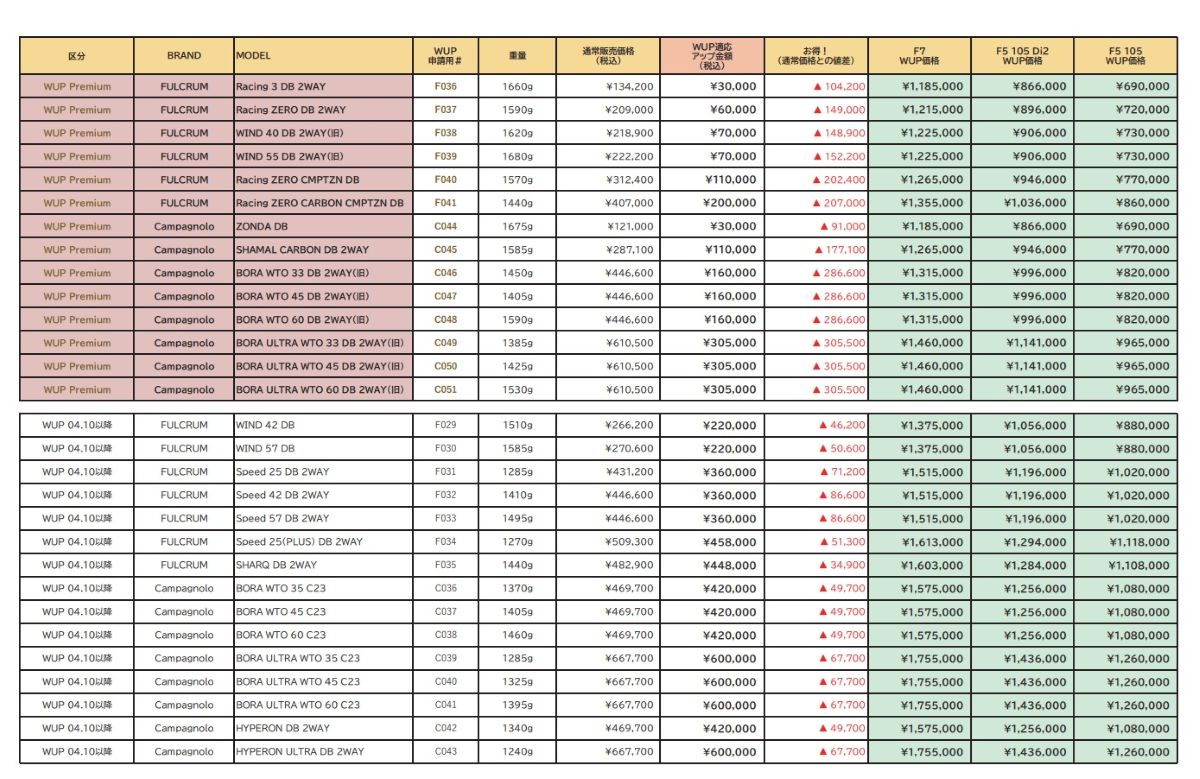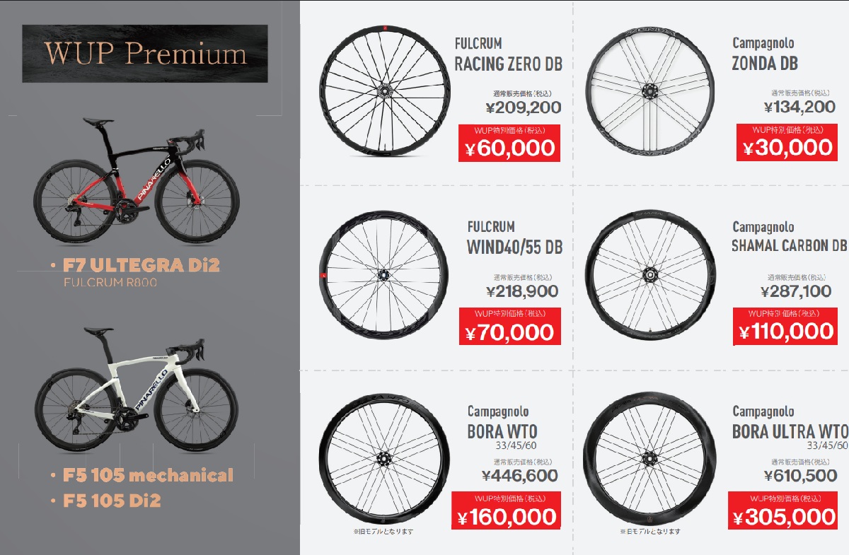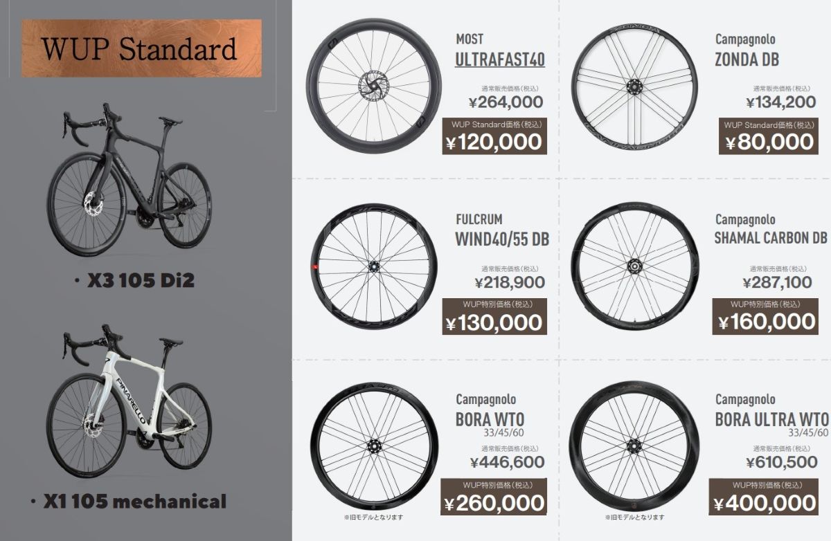あとで『WUPスタンダード』をご紹介しますが、このスタンダードに比べて指定のホイールがよりお求めやすい価格に設定されています。要は、もとの価格が高い自転車のほうがホイールの値引きが増えてお得ですよ、ということです。