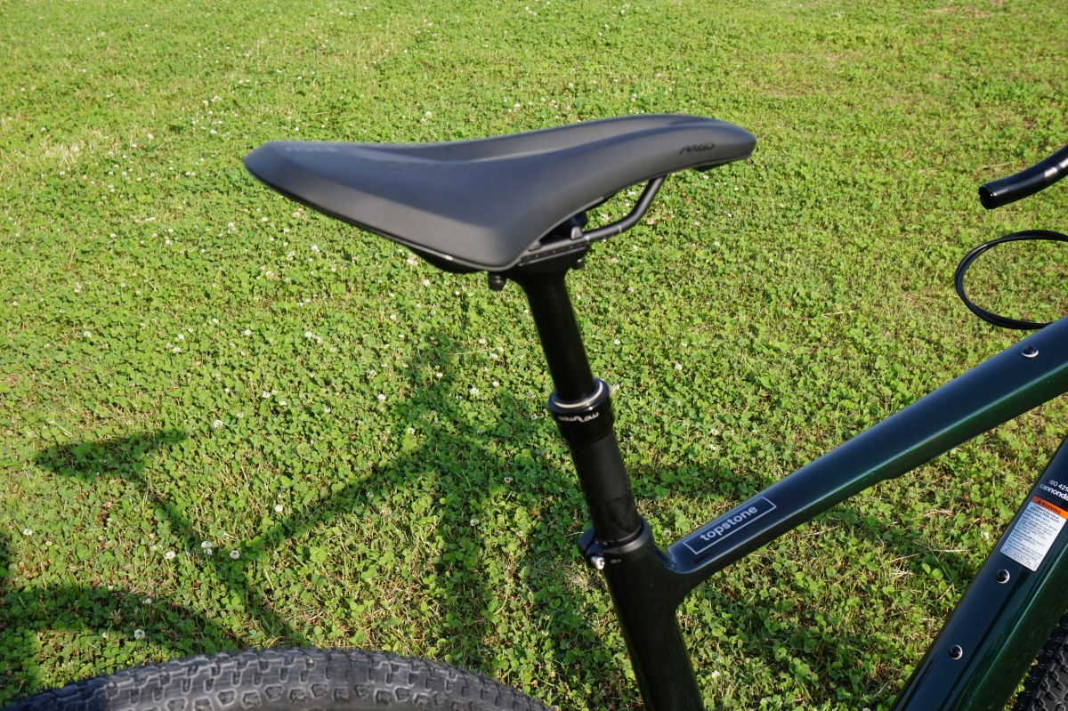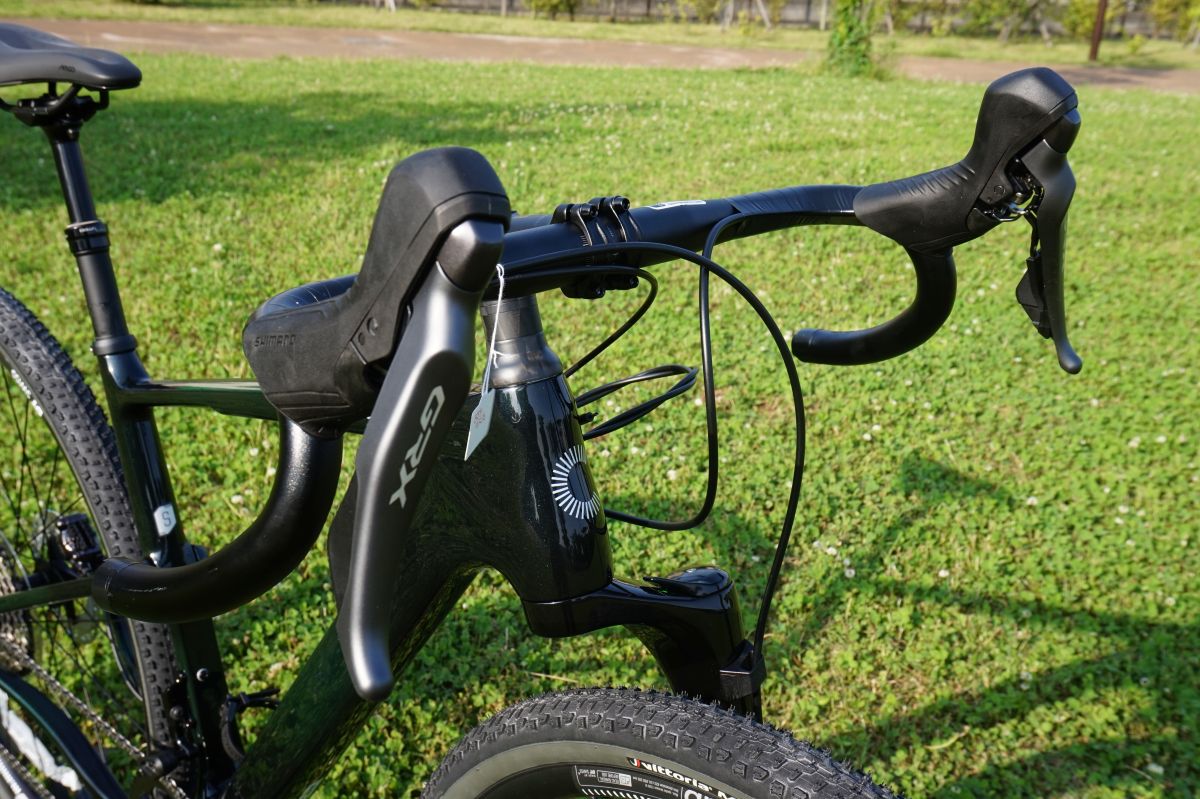 荒れた路面などで役立つのが、シートの高さを手元で操作できるドロッパーシートポスト。こちらを装備しています。前作であるGRX11速モデルではドロッパー操作用の左STIレバーで操作できたのですが、どうやらパーツの調達を間違えたのか?フロントシングルにもかかわらず、左STIレバーは『変速用』のものがついています。
