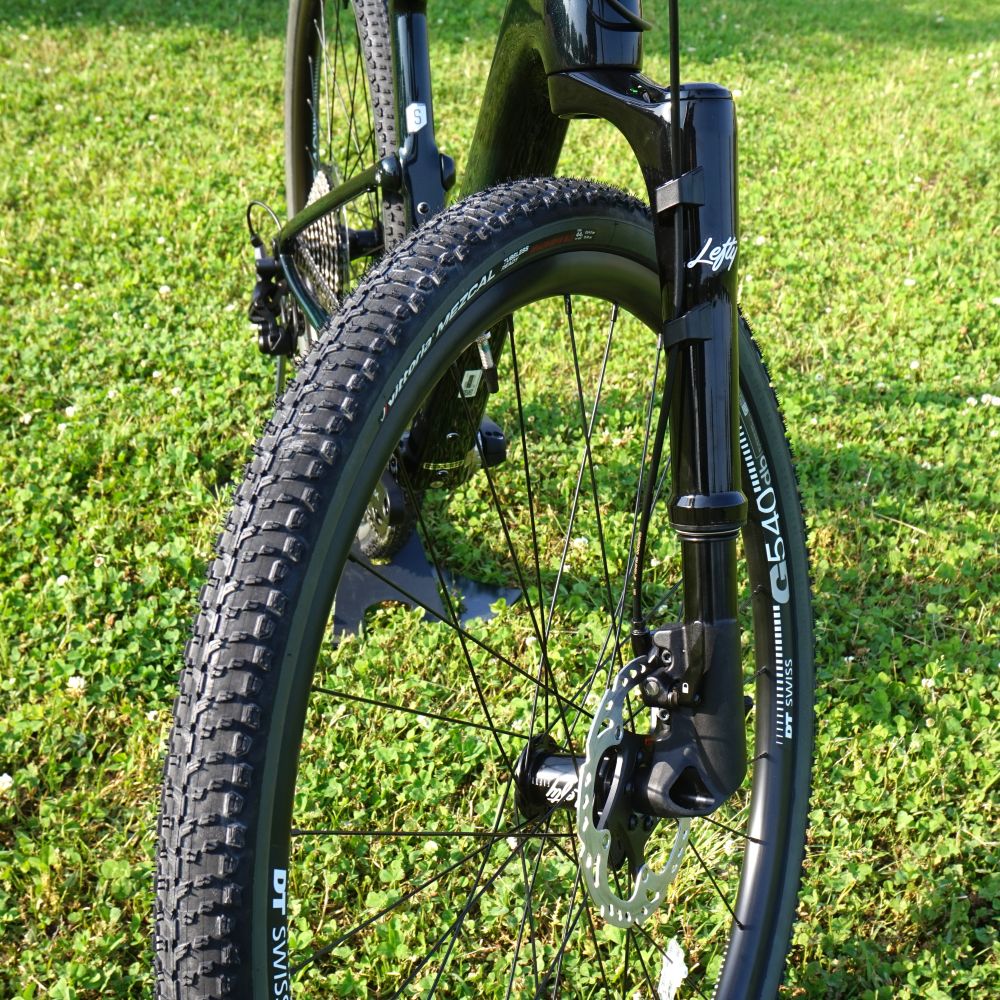 A:フレームそのものは同一ですが、Leftyフロントフォークが『1』ではカーボン製のケース、『2』はアルミ製ケースになっており、カタログスペックではそれぞれ1,370gと1,610gの違いがあります。コンポーネントはSRAMの無線電動FORCE eTap AXS 1×12速、ホイールもHollowgram G-S27というカーボン製でリム内幅が27mmもあるものを採用。完成車持ち上げてみるとビックリするくらい軽いです。