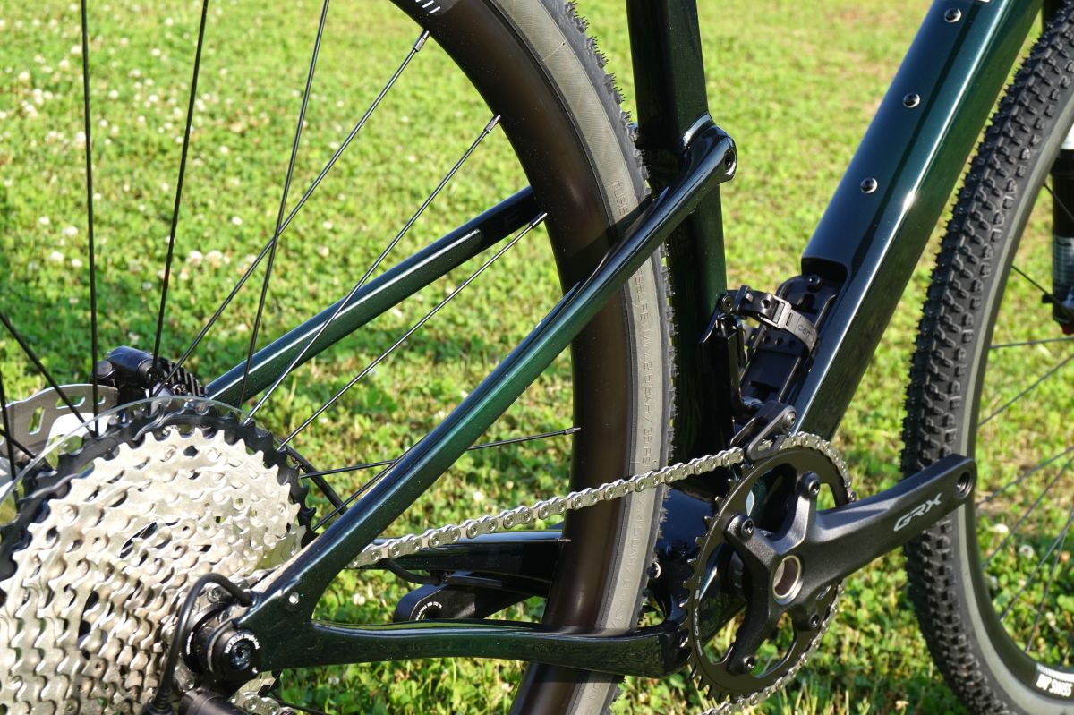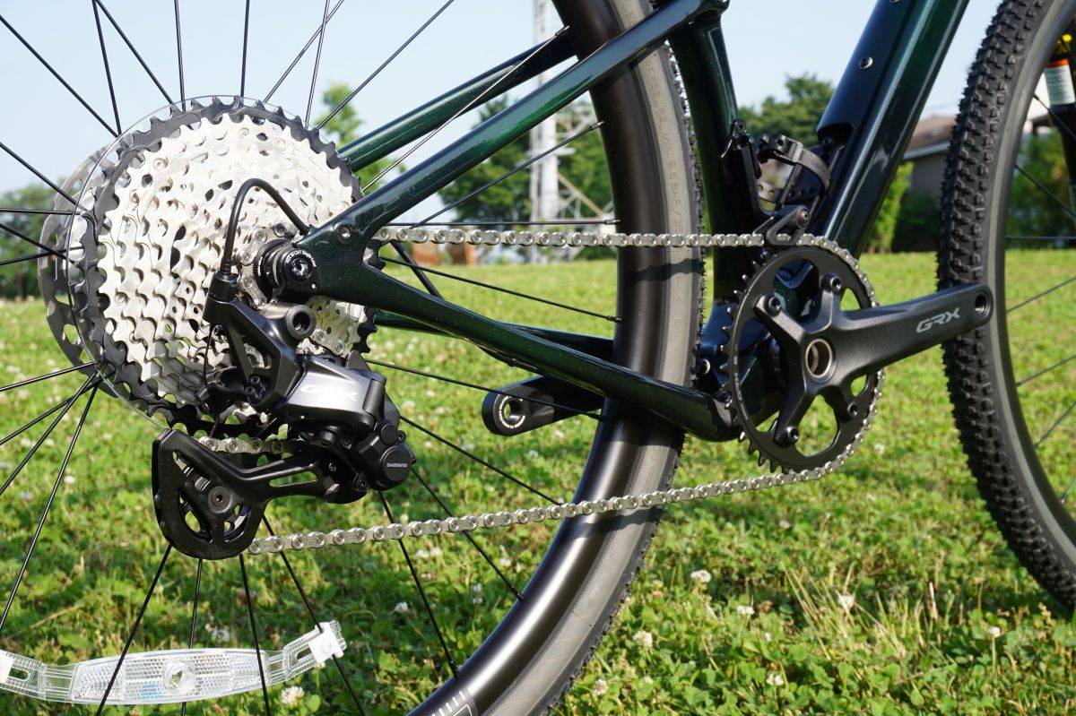 機械式変速のシマノGRX R820シリーズが搭載されています。ギア比は前40T、後10‐45T。もっとも軽いギア比は0.88。このくらいあると、国内の激坂グラベルはなんとかなります。そしてフロントシングルなので、荒れたオフロードでもチェーン外れしにくい!